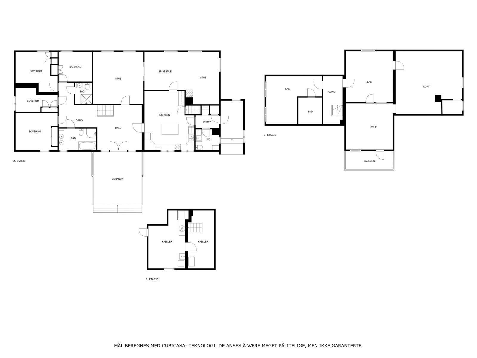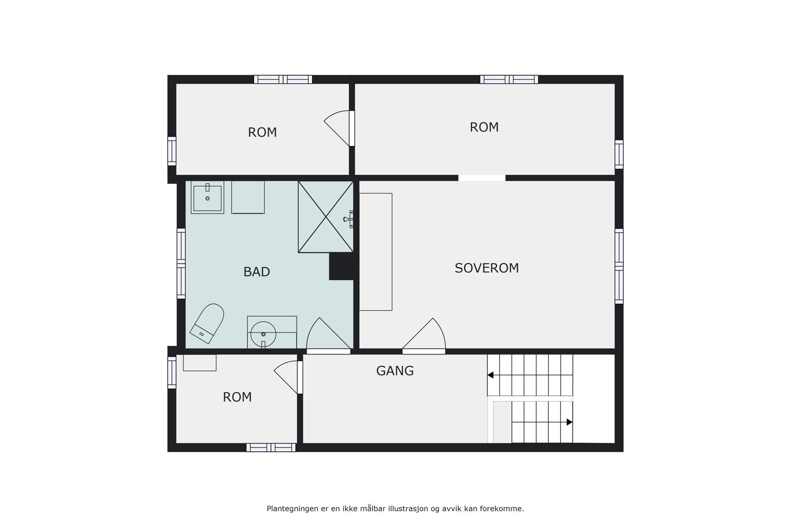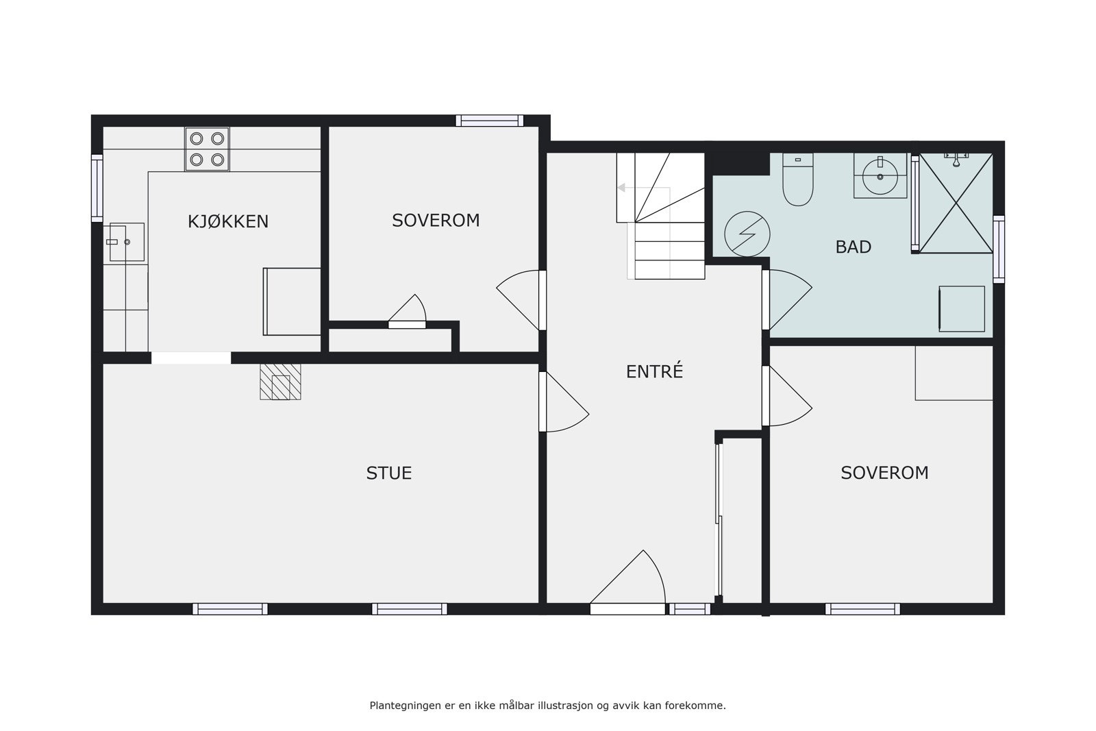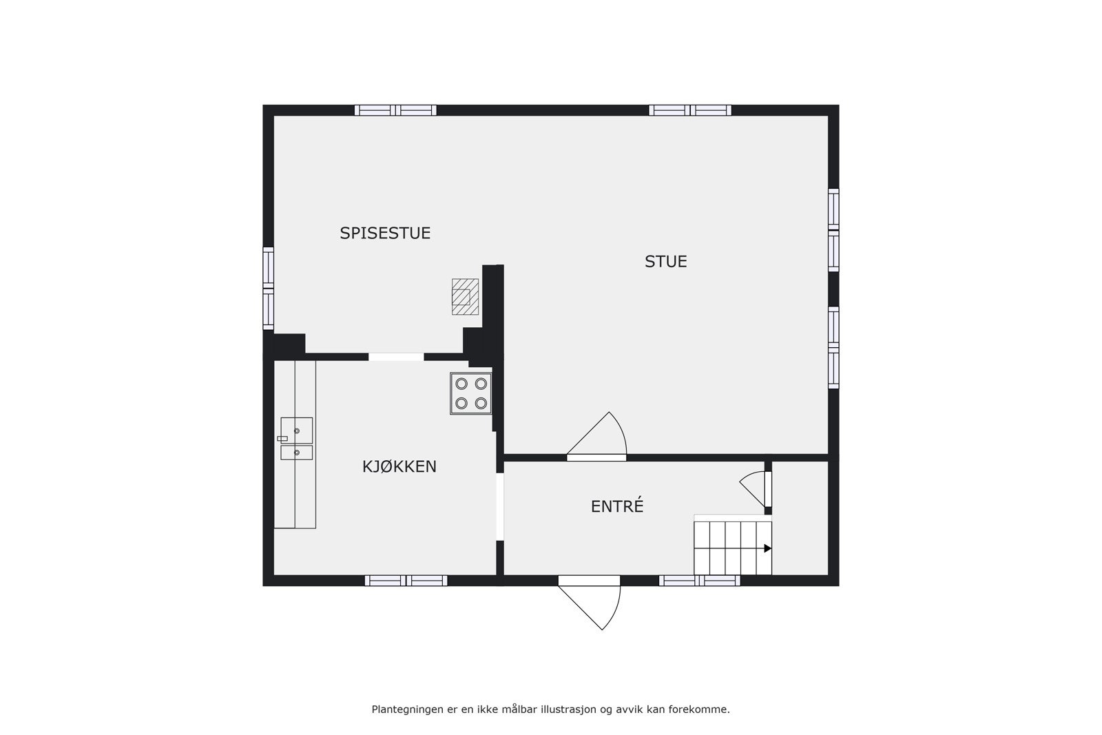 1. etasje: Vindfang, toalettrom, bad, vaskerom, kjøkken, trapperom, spisestue, stue og alkove