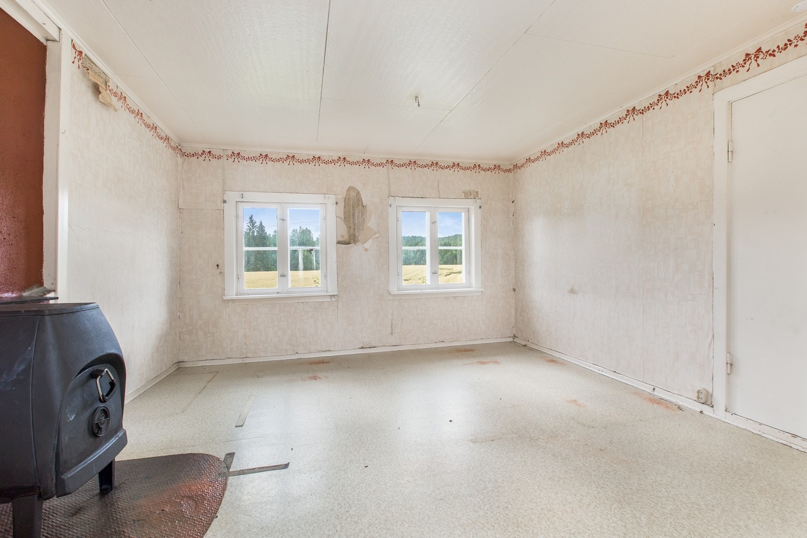 av maling på overflater. Gulv i 2. etasje ved pipe har tegn på tidligere