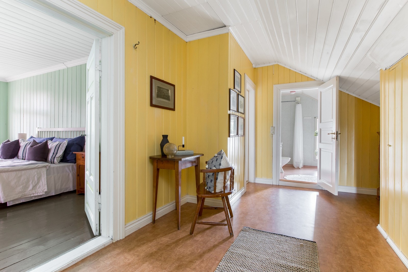 bibliotek/soverom, kjøkken/allrom, et mindre bad og hall med trapp til 2. etasje. Andre etasje har også full