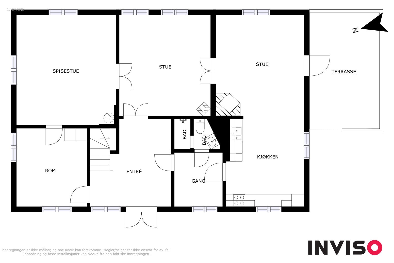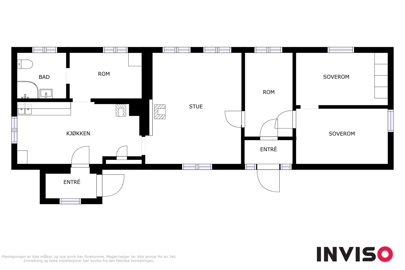 entré, kjøkken, stue, to soverom og to bodrom. Det er opprinnelig to adkomster til bygningen.