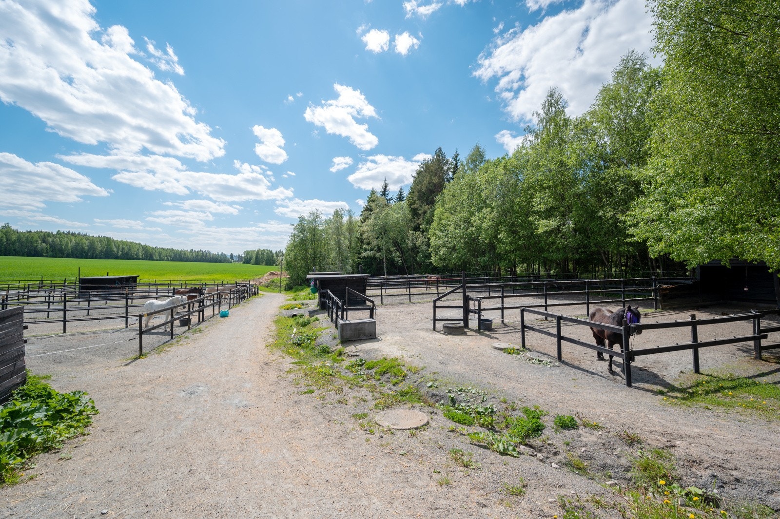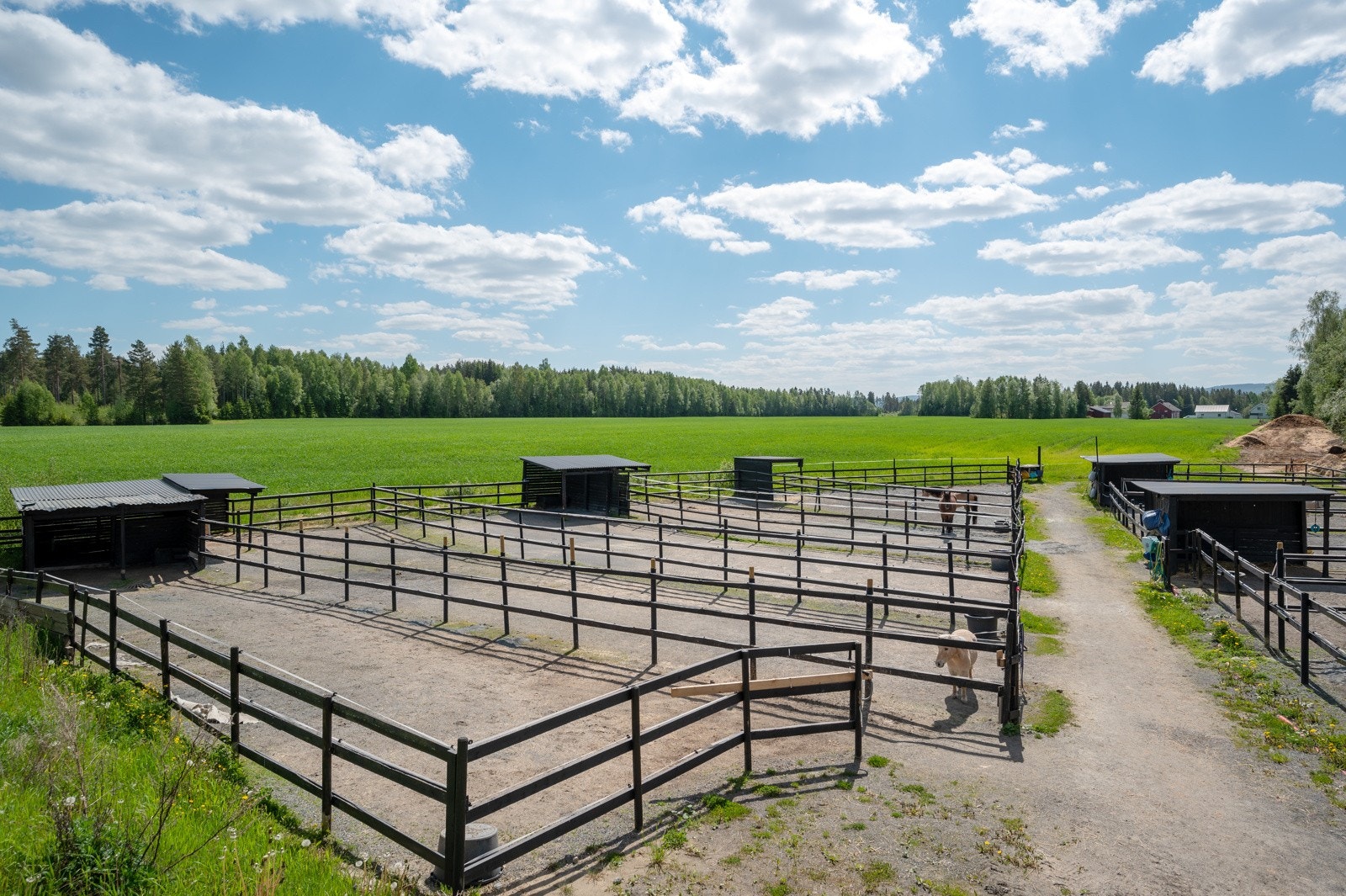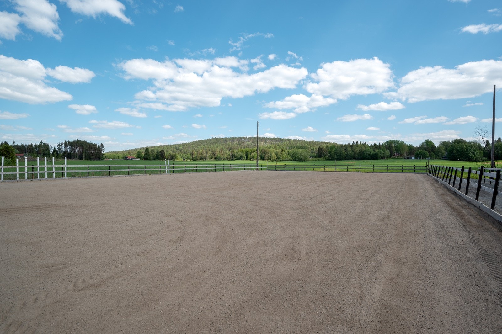 De utvendige arealene på eiendommen består av 17 paddocker og to ridebaner på omkring 30 x 60
