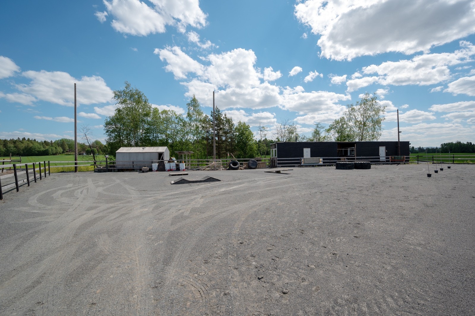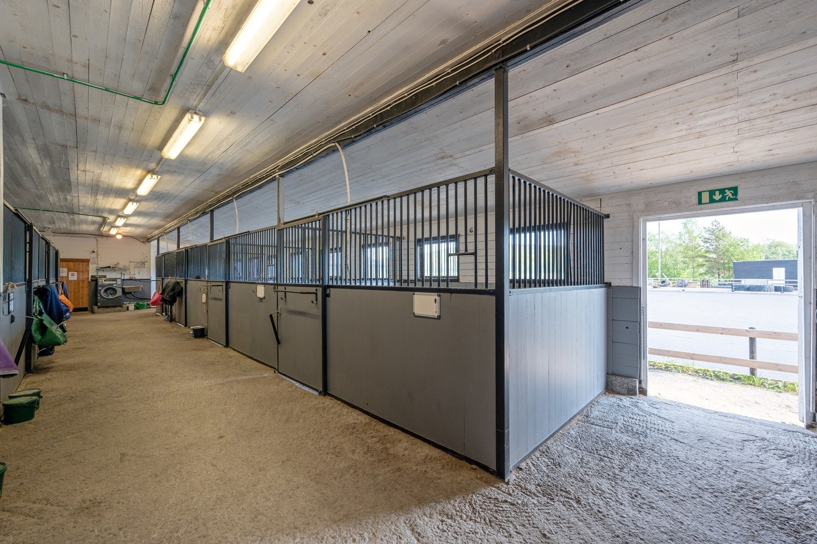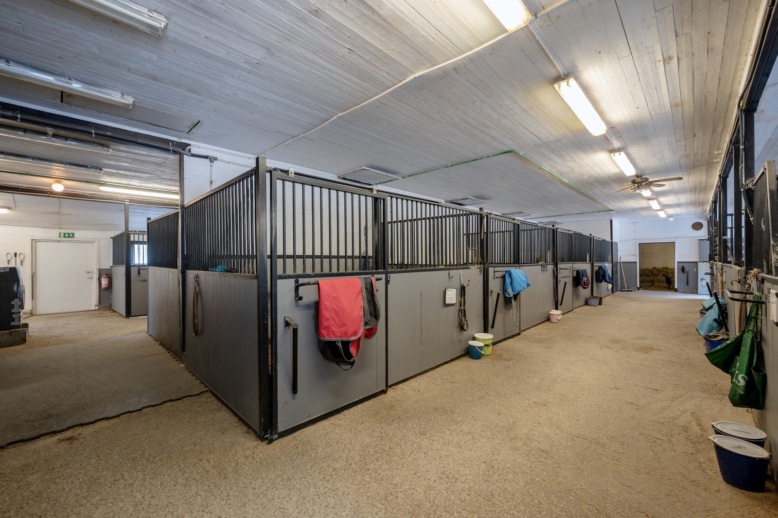 og separat stallbygning med 17 bokser. Utvendig er det etablert to ridebaner med internasjonale mål, 17