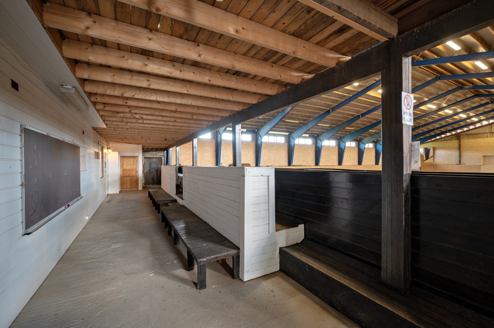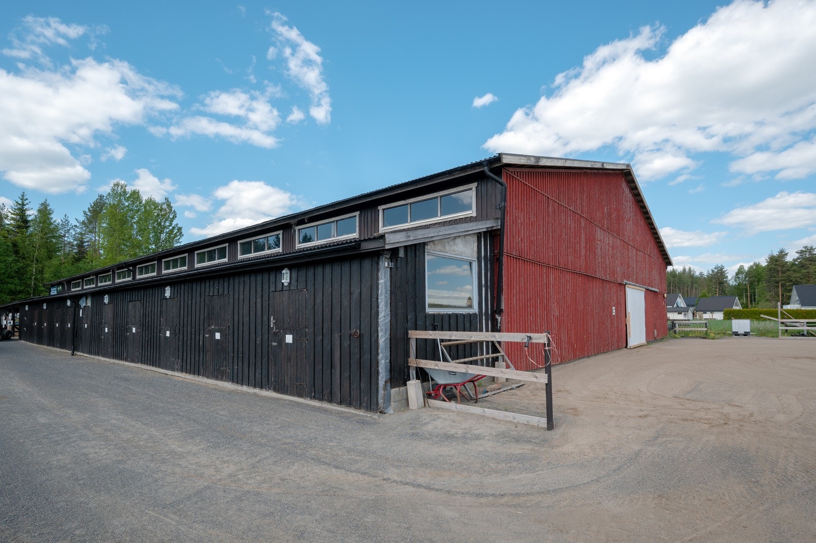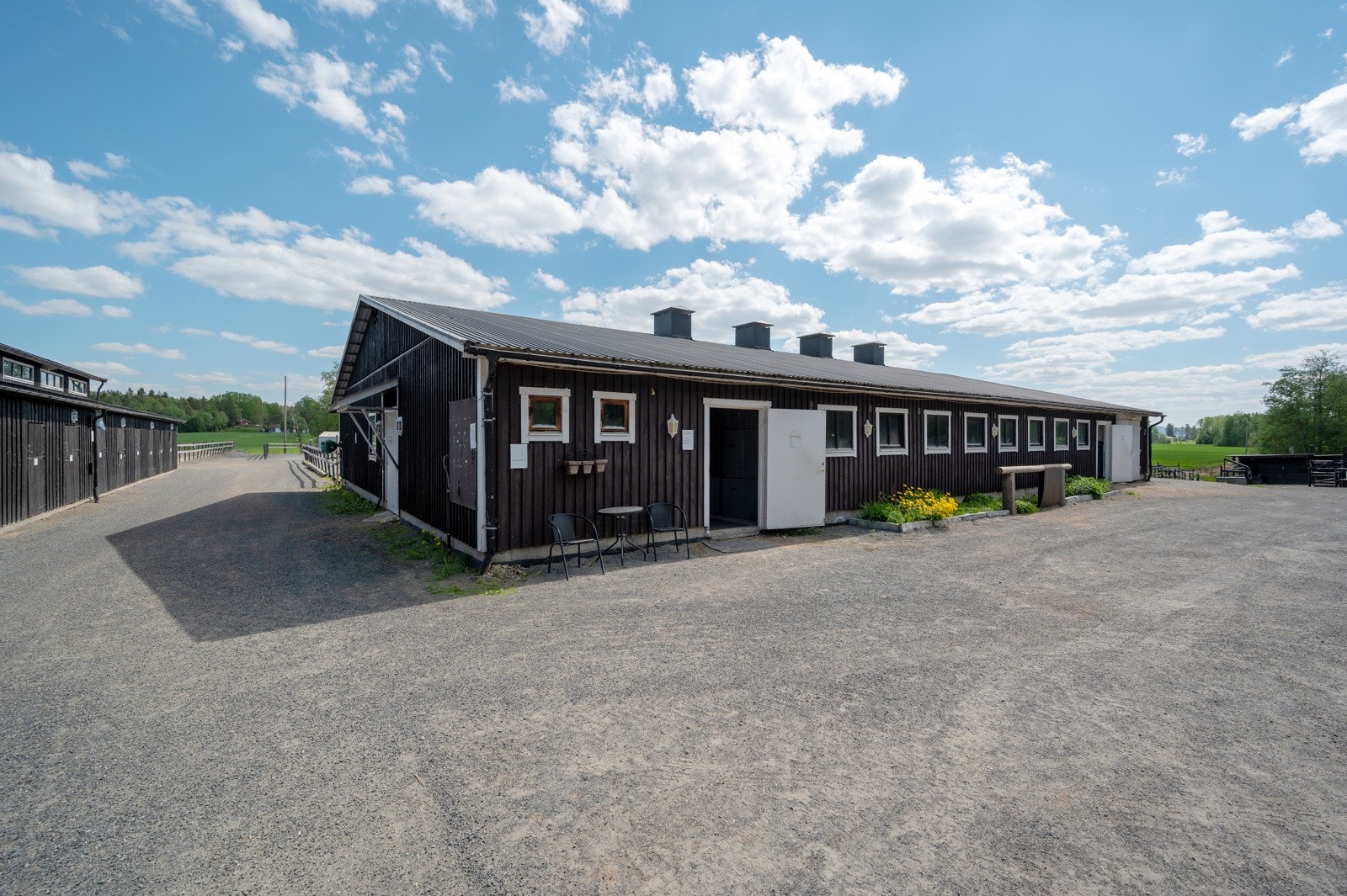 og separat stallbygning med 17 bokser. Utvendig er det etablert to ridebaner med internasjonale mål, 17