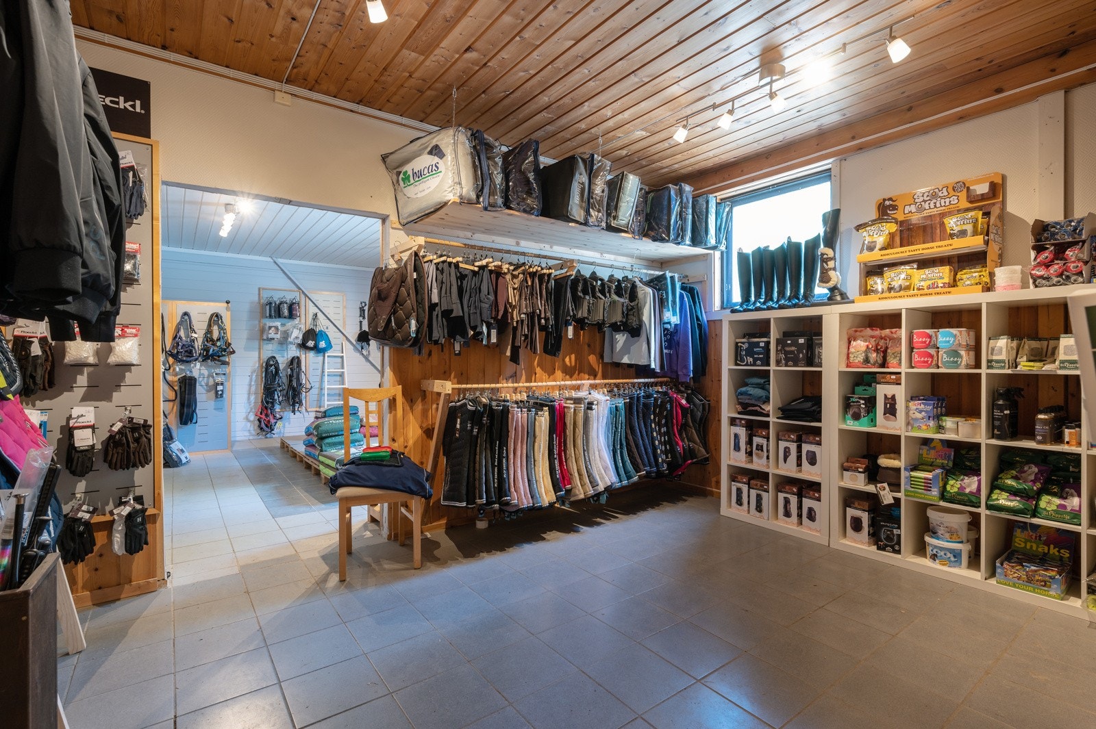 I bygningens vestgavl er det etablert hesteutstyrsbutikk og wc/vaskerom i 1. etasje og i 2. etasje har man