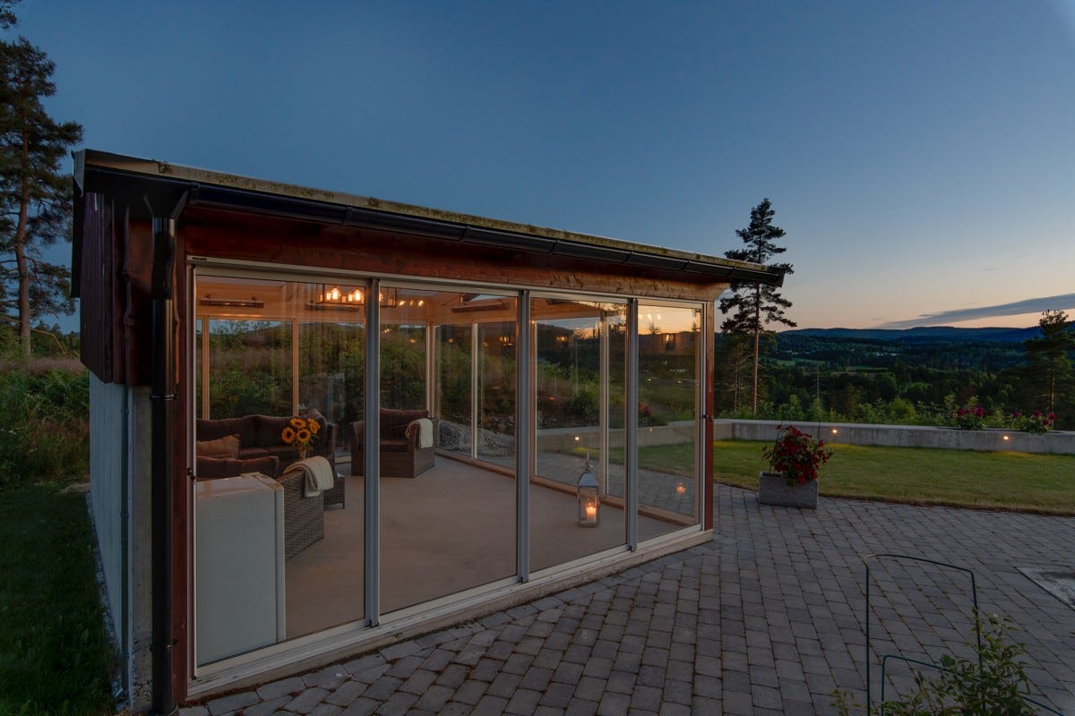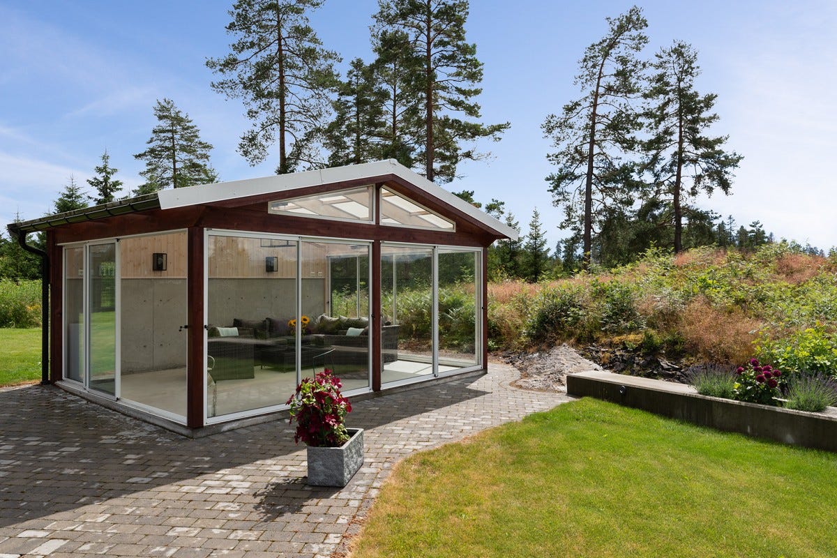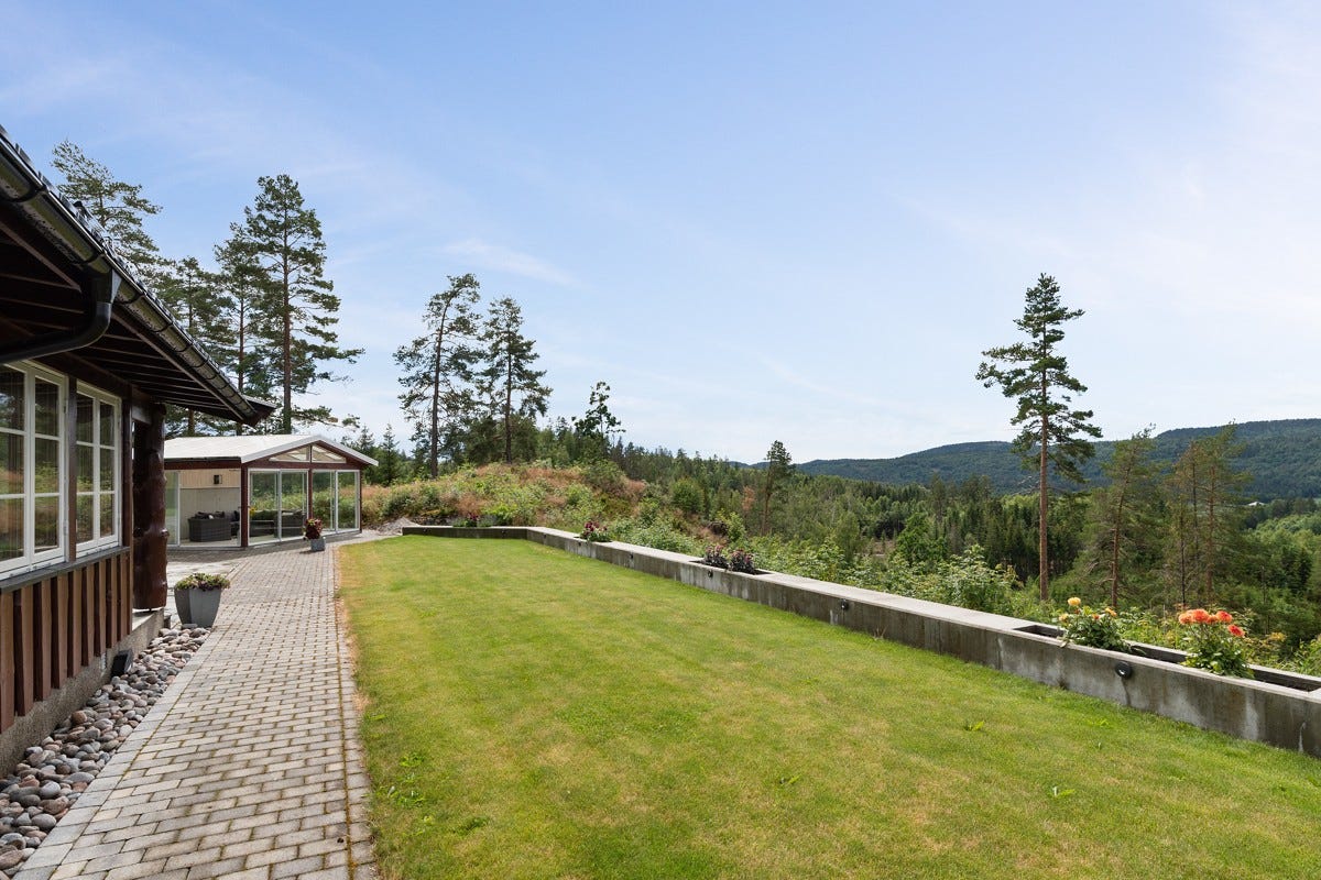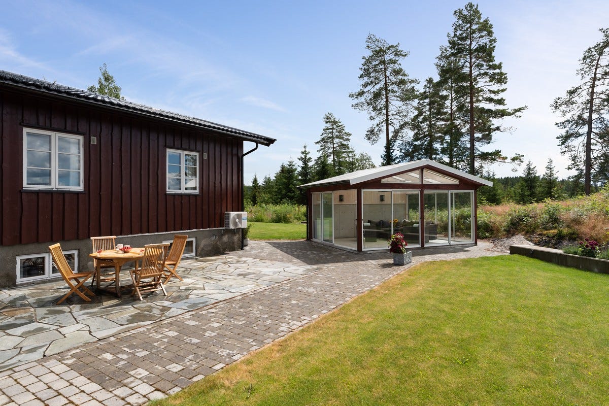 opparbeidet uteplass og egen frittstående, innglasset og forseggjort hagestue. Det er videre plassert en