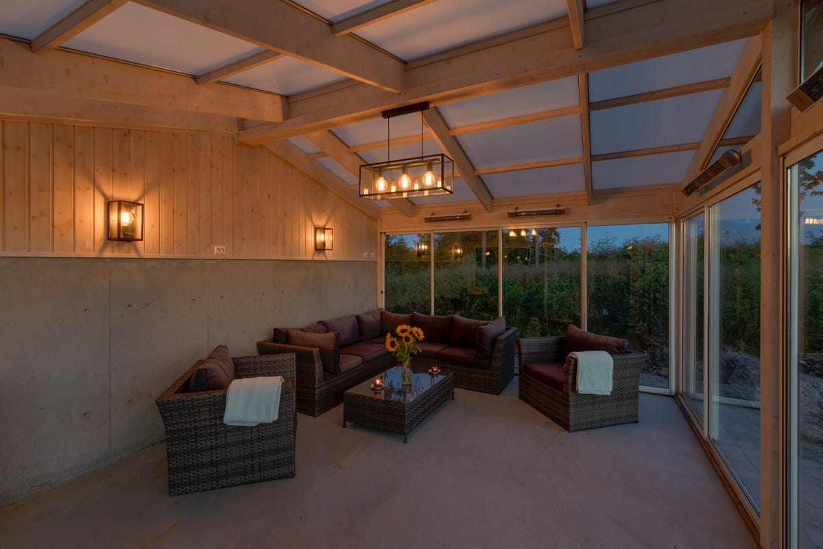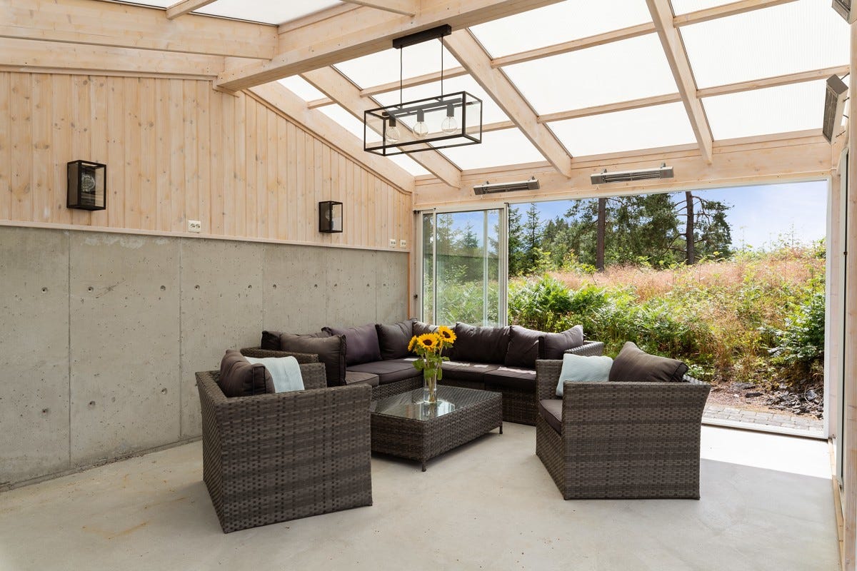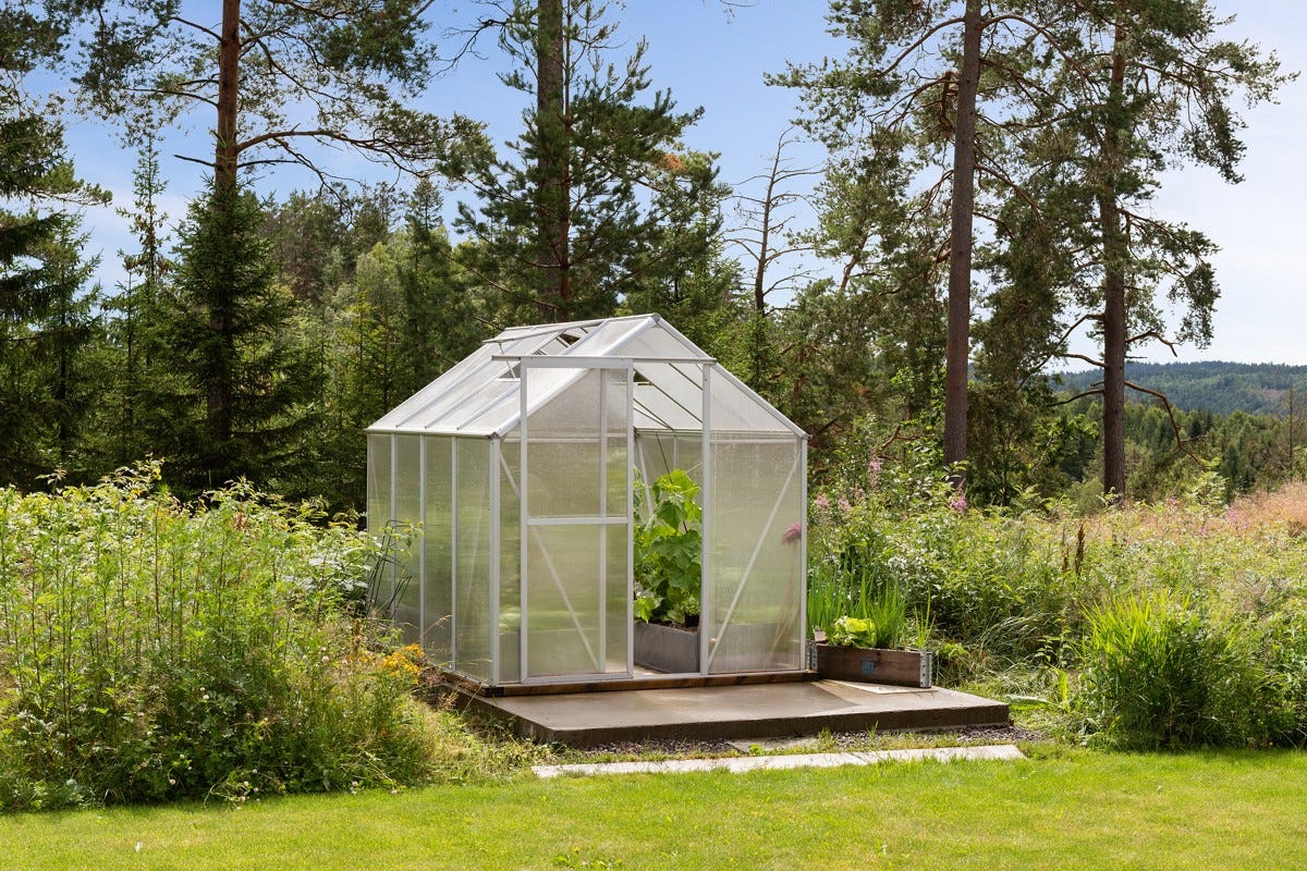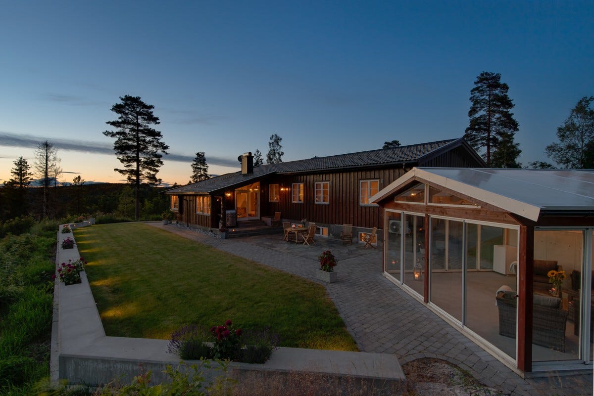 opparbeidet uteplass og egen frittstående, innglasset og forseggjort hagestue. Det er videre plassert en
