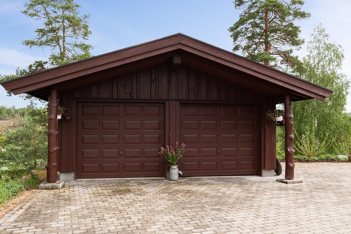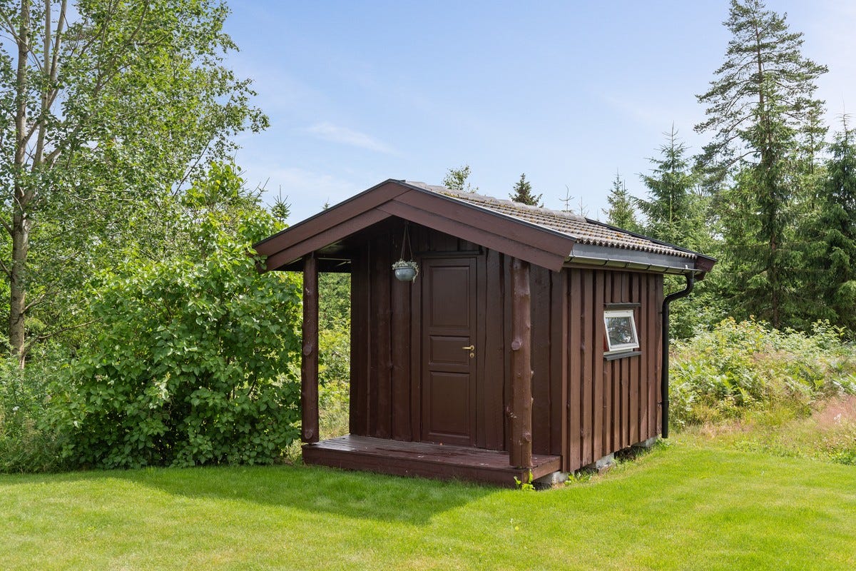 dobbelgarasje og lekestue på eiendommen.
