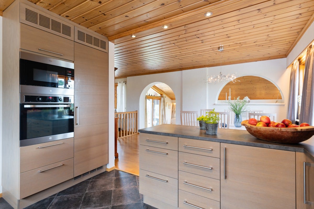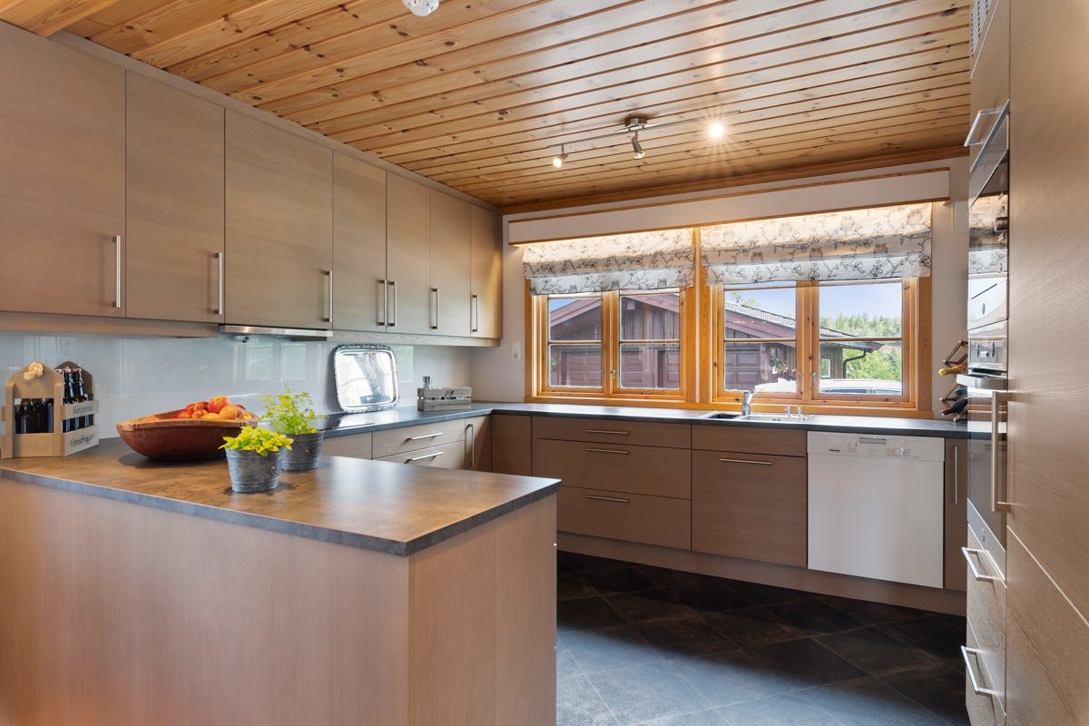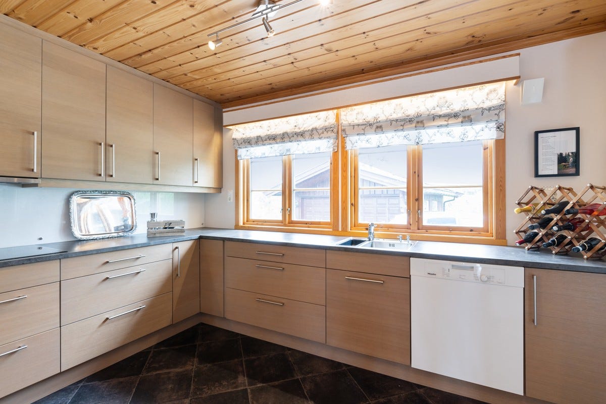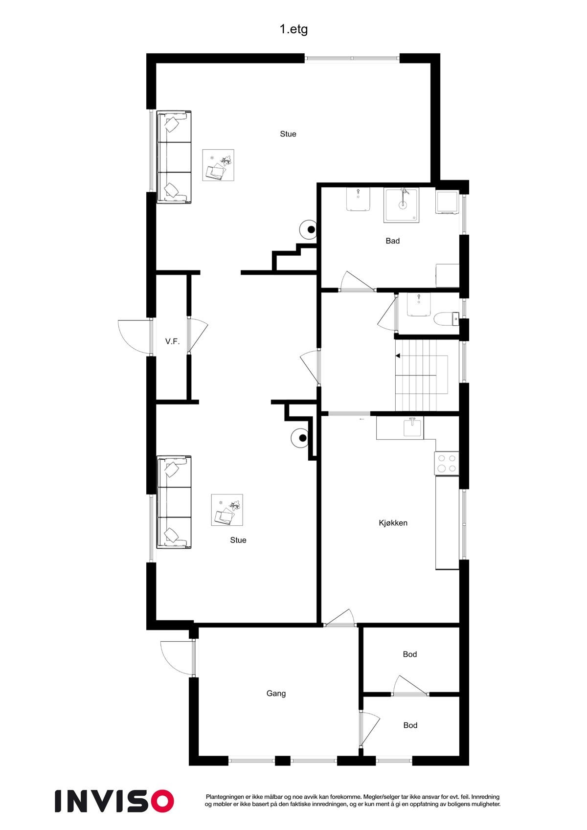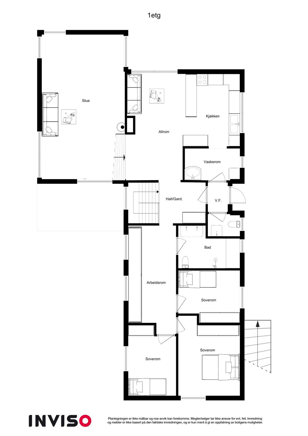 spisestue, kjøkken, grovkjøkken/vaskerom, bad, wc, vindfang og 3 soverom. Det er videre utgang til en flott