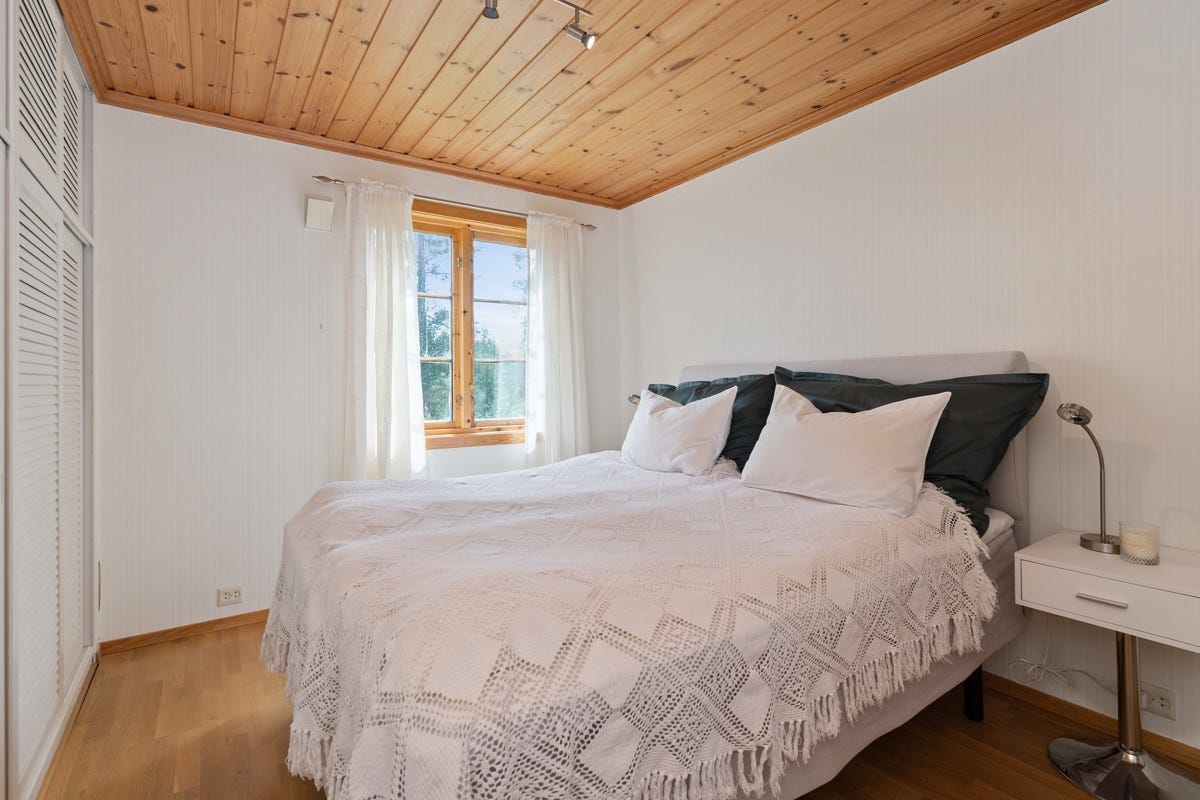 soverom, soverom/stue og et større uinnredet rom i nordenden av bygget. Det er utgang til to verandaer