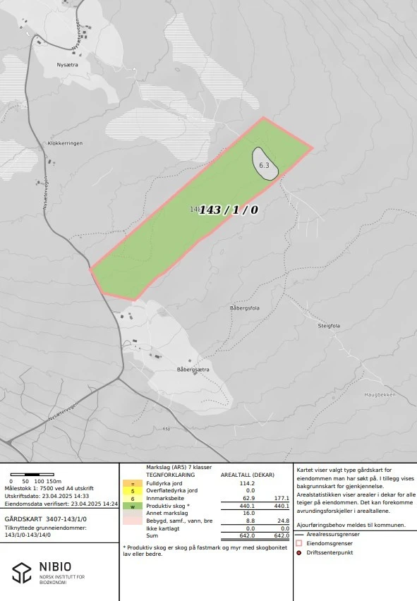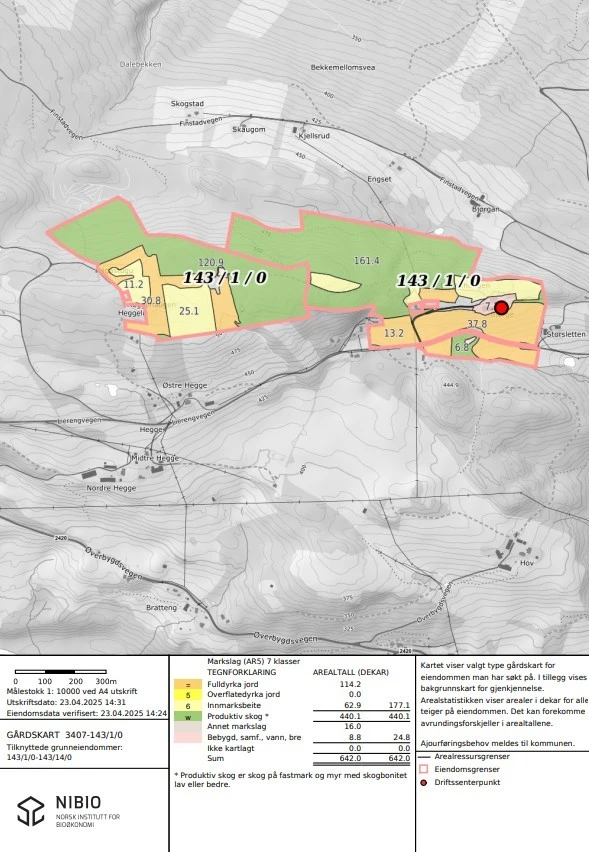 Eiendommen består av 177,1 daa. jordbruksarealer, fordelt på 114,2 daa. fulldyrket jord og 62,9 daa. innmarksbeite. Det er 440,1 daa. skog. Samlet består eiendommen av 642 daa.