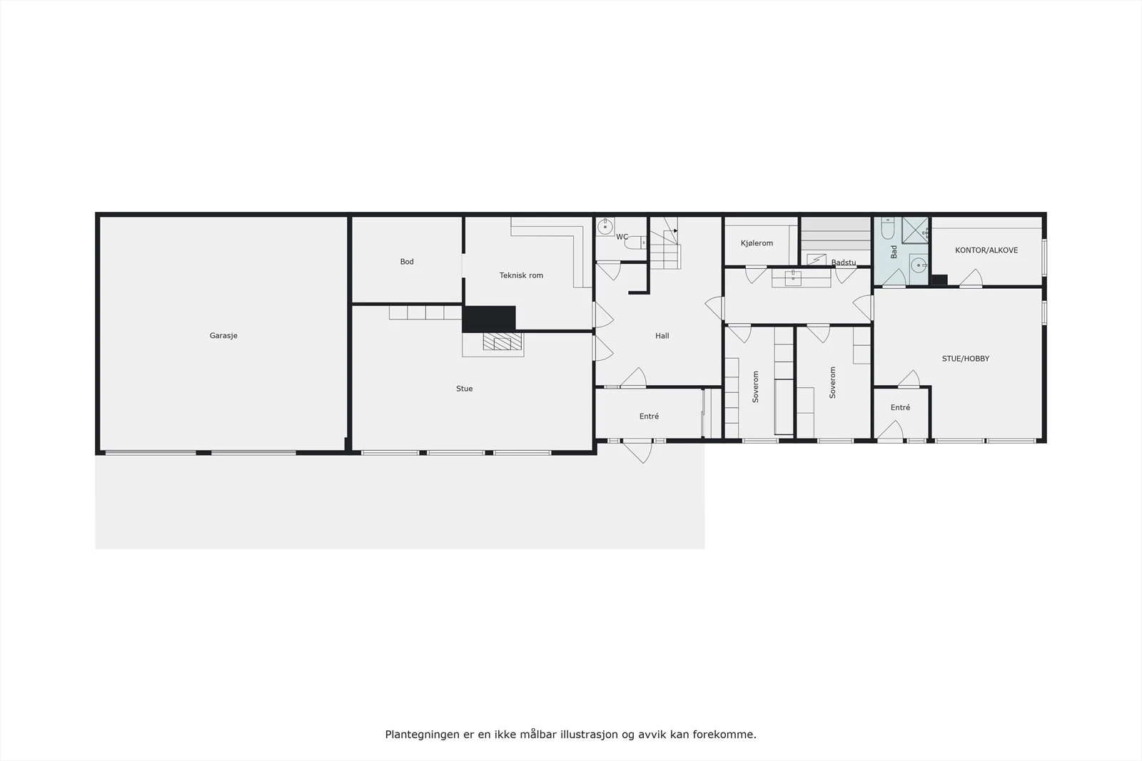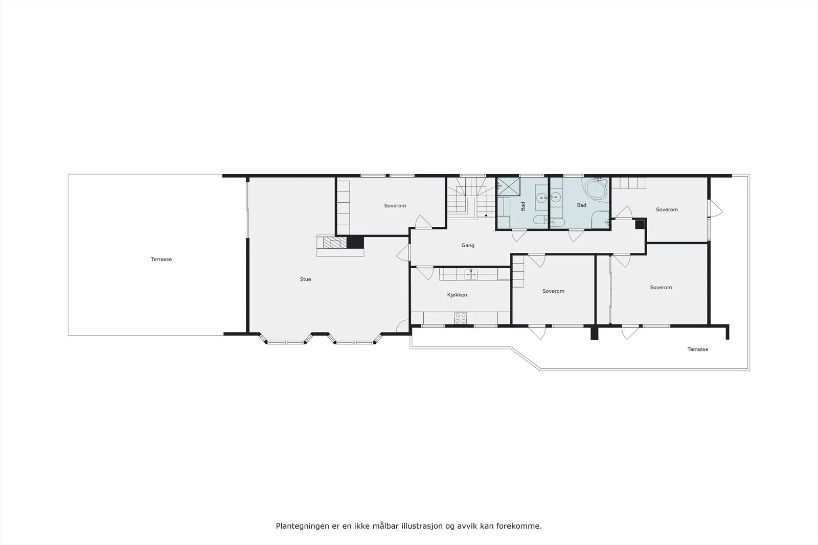 1. etasje (170 kvm.): Gang, 2 bad, kjøkken, stue og 4 soverom.