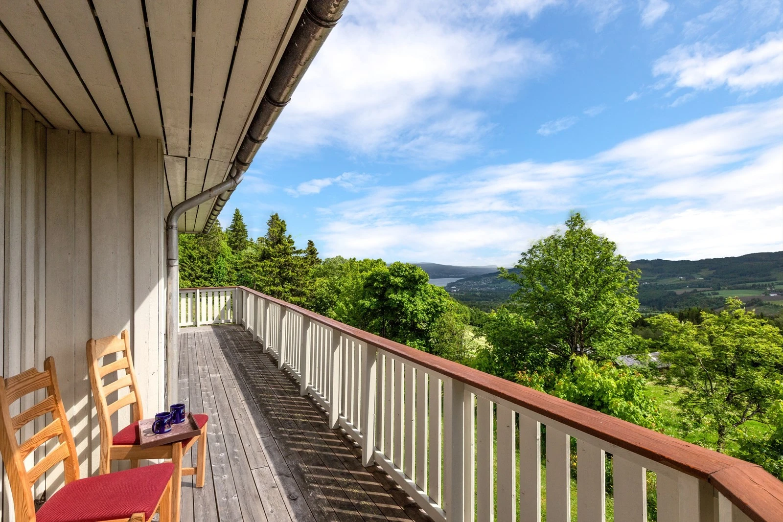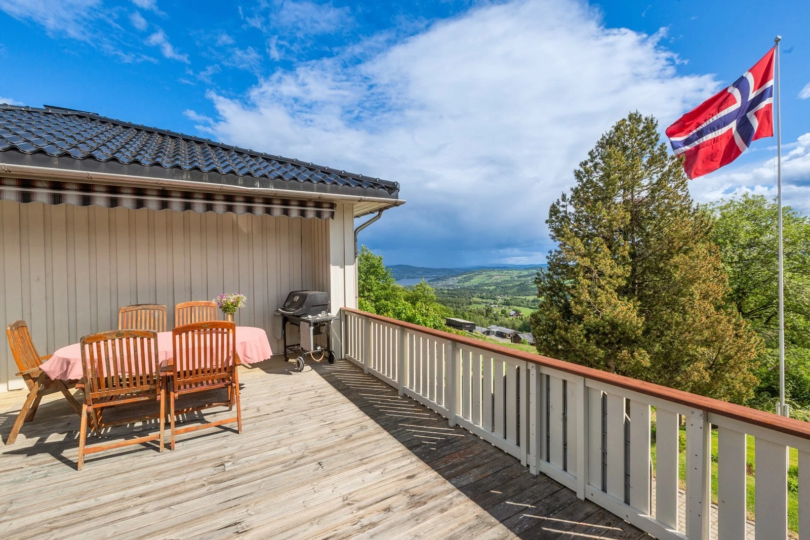 Terrasse med utgang fra stue over garasje. Rekkverk og gulv i trekonstruksjoiner. Markise over. Det antas å være tekket med folie under tregulv. Veranda med utgang fra soverom. Konstruksjoner og overflater i treverk. Terrasser/verandaer som står under åpen himmel vil alltid ha vedlikeholdsbehov, dette må påregnes.