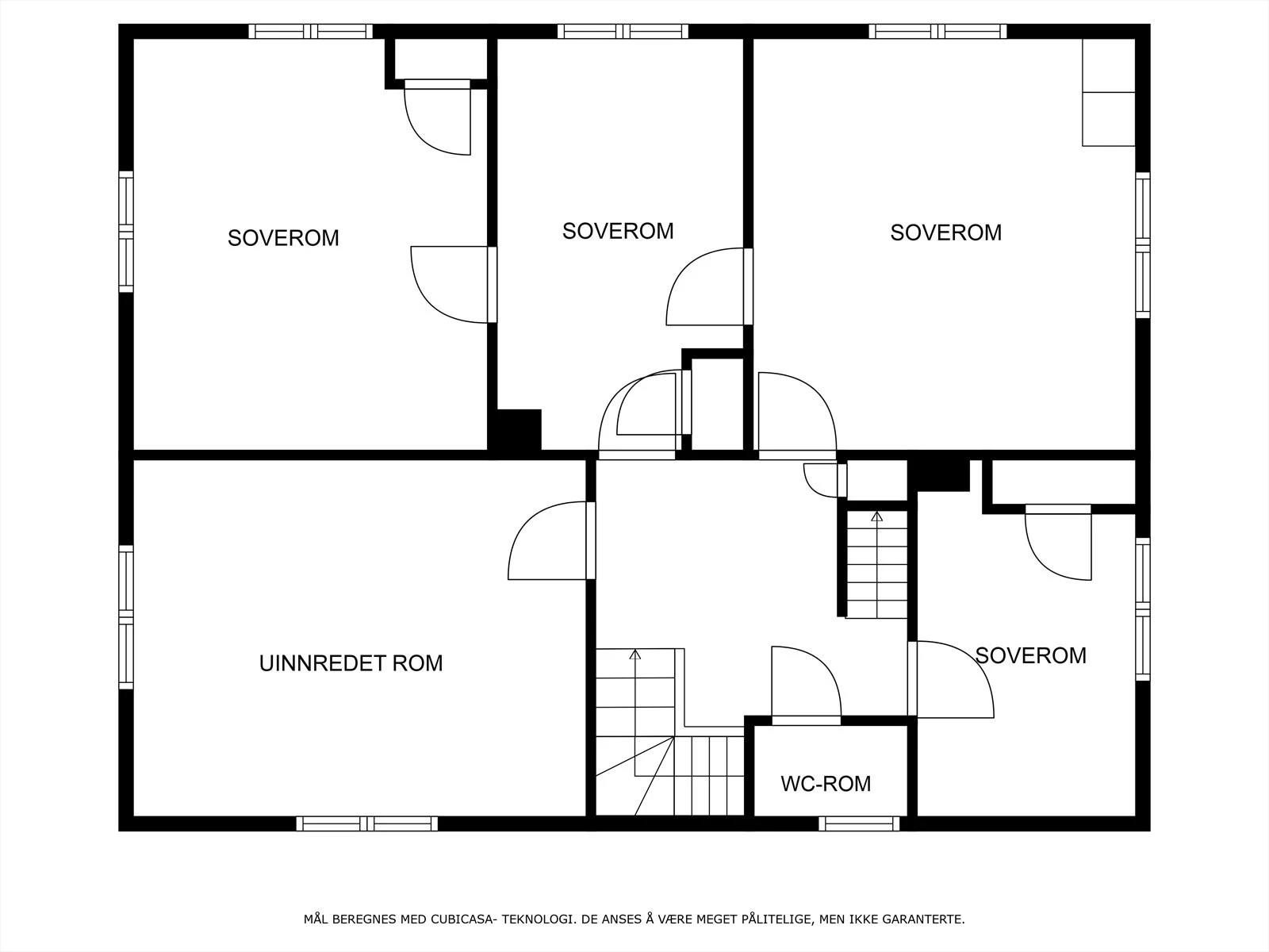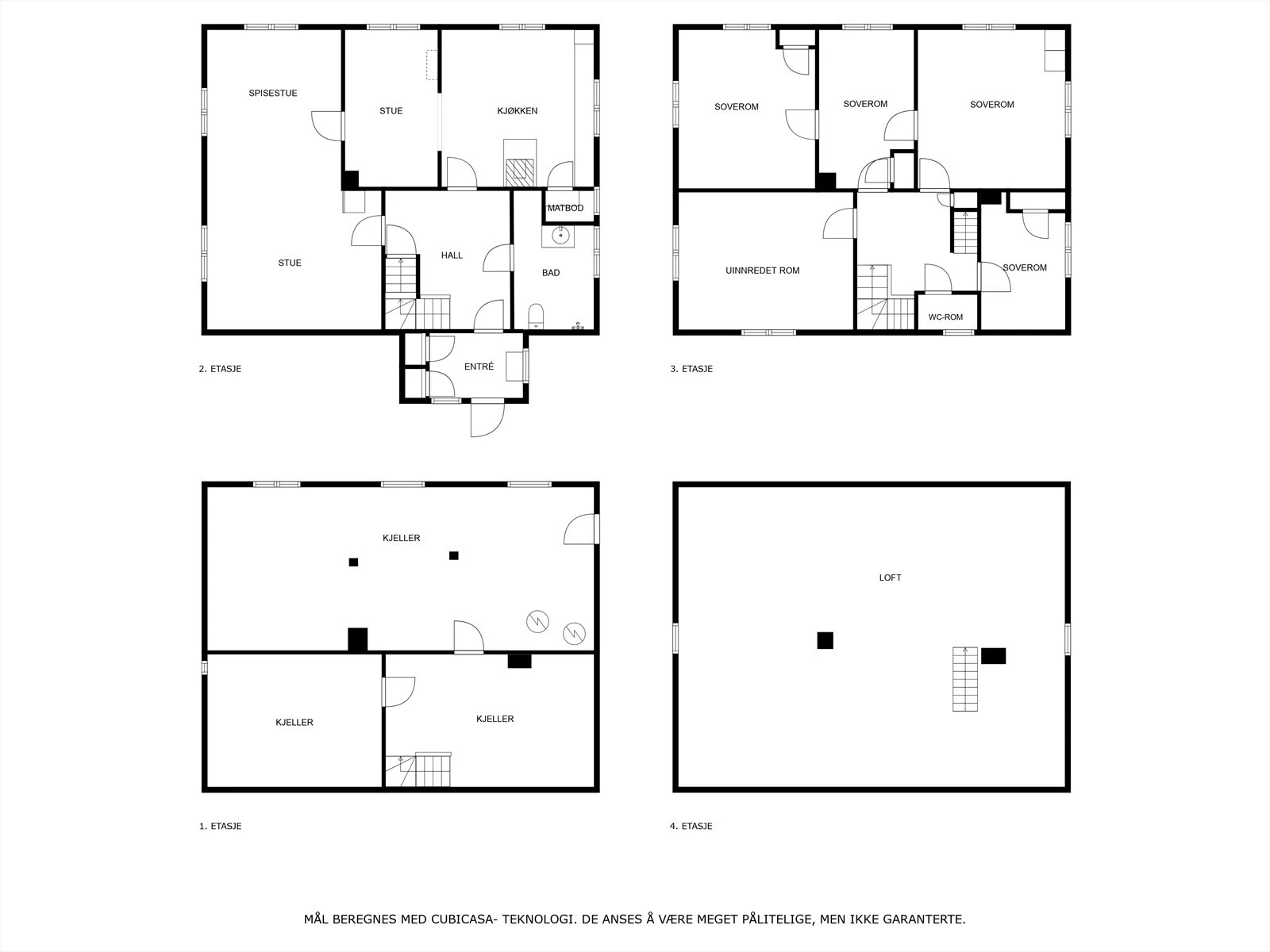 2 etasje (100 kvm.): Hall med trapp, uinnredet rom, toalettrom uten toalett og 4 soverom.