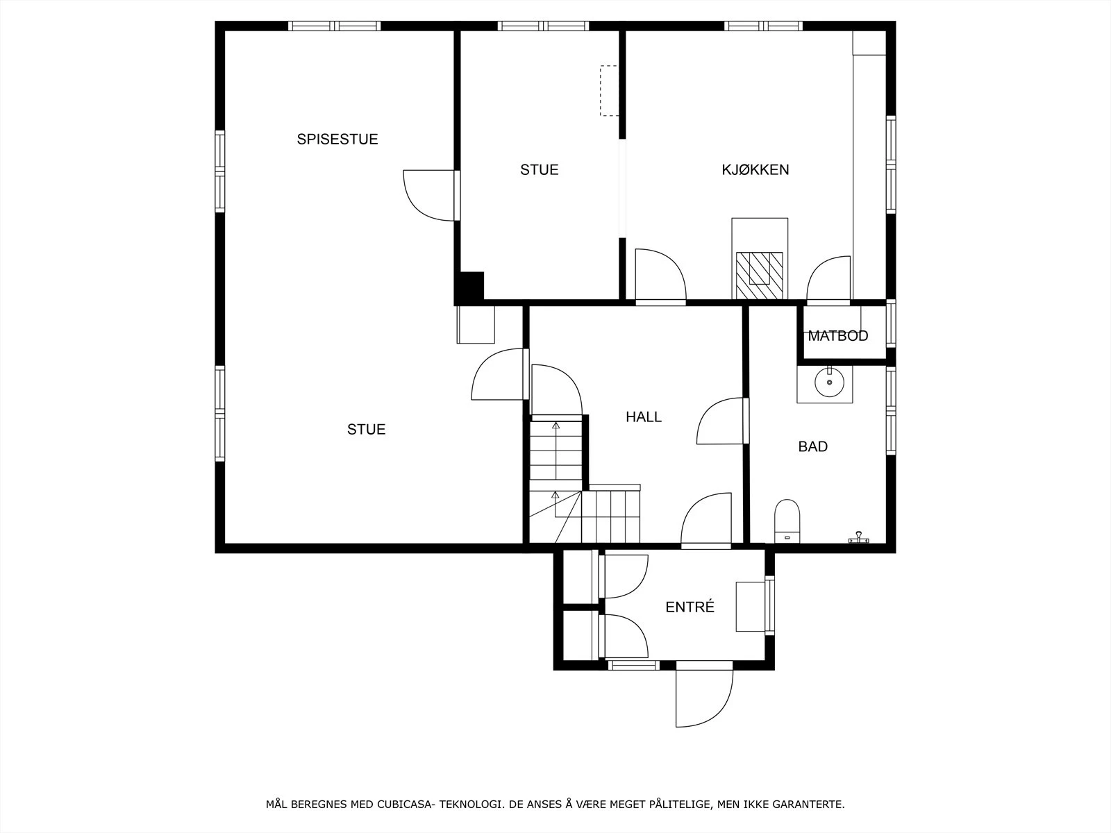 1. etasje (106 kvm.): Vindfang, hall med trapp, kjøkken, kammers, bad og stue.