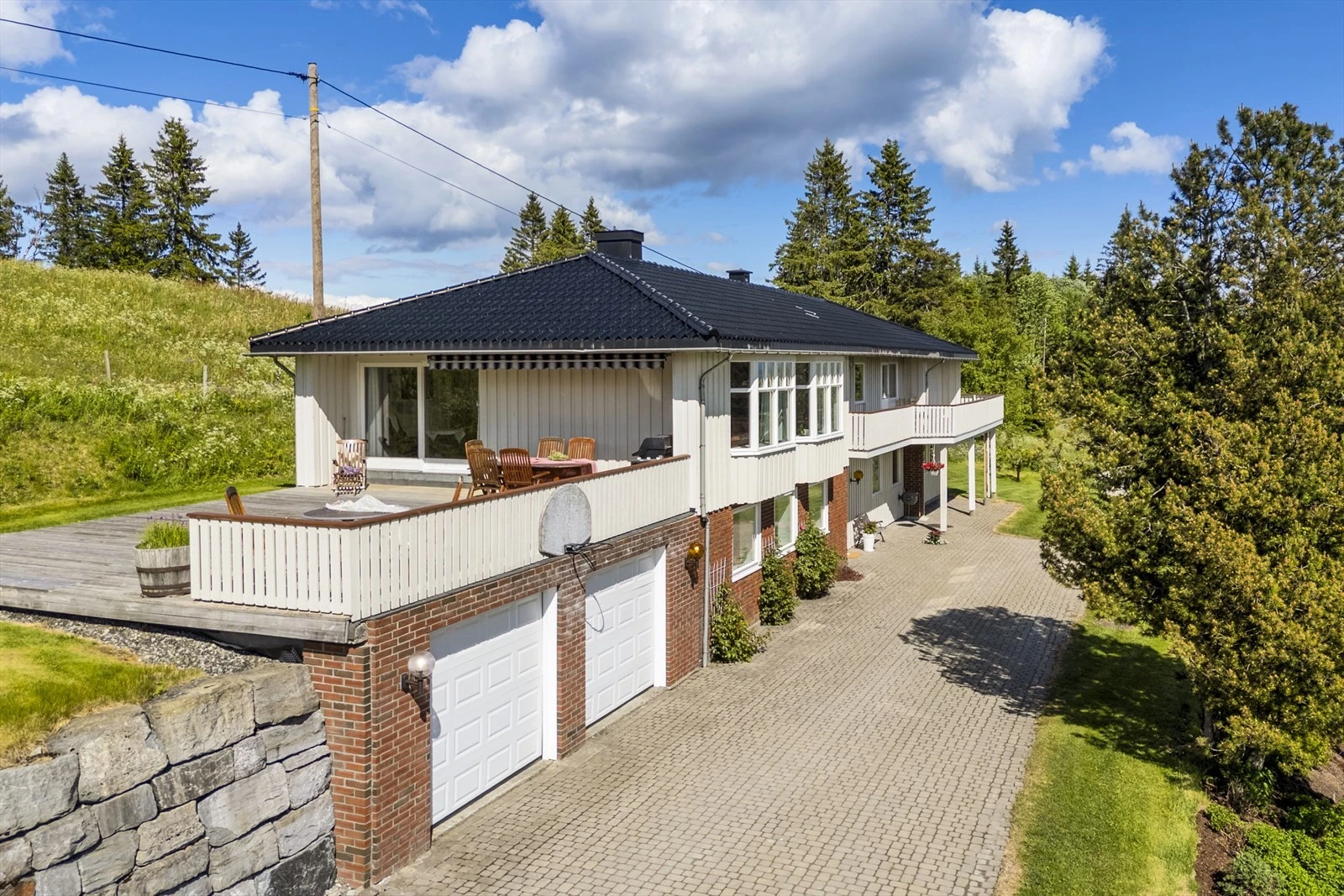 Vegger over terreng oppført i bindingsverkskonstruksjoner, antatt isolert, luftet og kledd med malt trepanel. Valmet tak-konstruksjon bygget med taksperrer i trekonstruksjoner. Tak tekket med metallplater, tilhørende takrenner, nedløp og beslag. Vinduer og dører med isolerglass. Veranda med utgang fra stue over garasje, overflater med impregnerte materialer. Rekkverk i malt utførelse. Trapp til terreng. Lufteveranda med utgang fra soverom.
