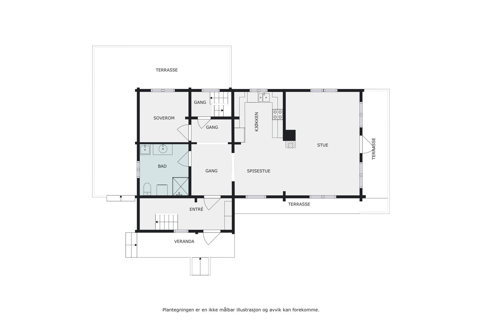 Det er også en punktfundamentert veranda med trebjelkelag, spalteplank og malt rekkverk med tilkomst fra utvendig trapp. Areal ca. 34m².