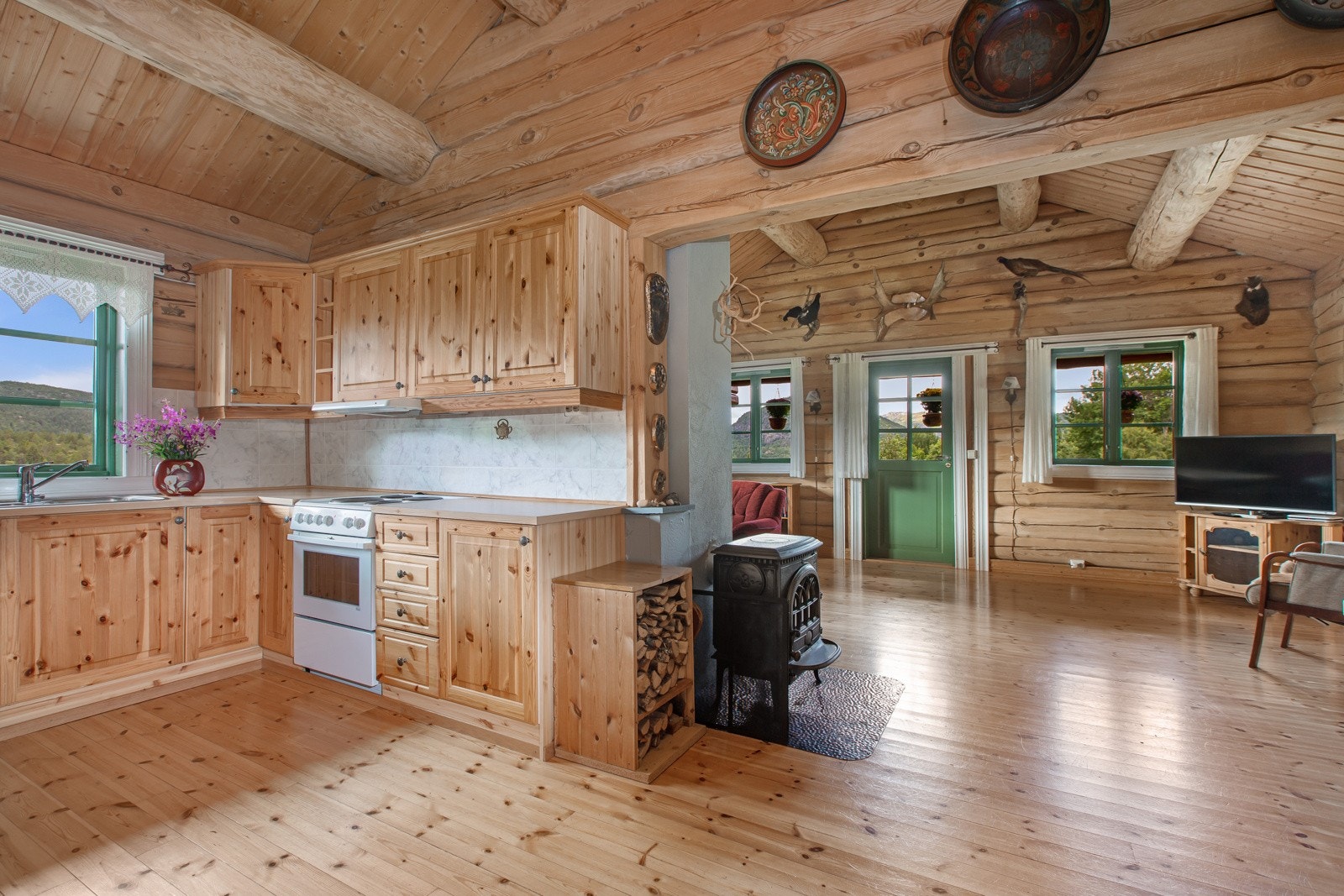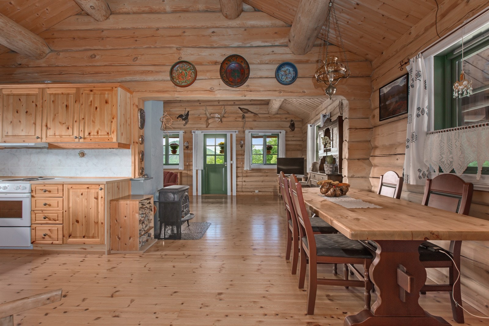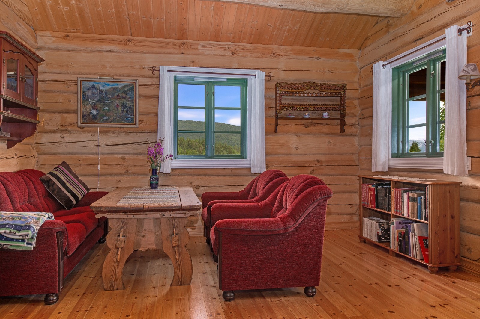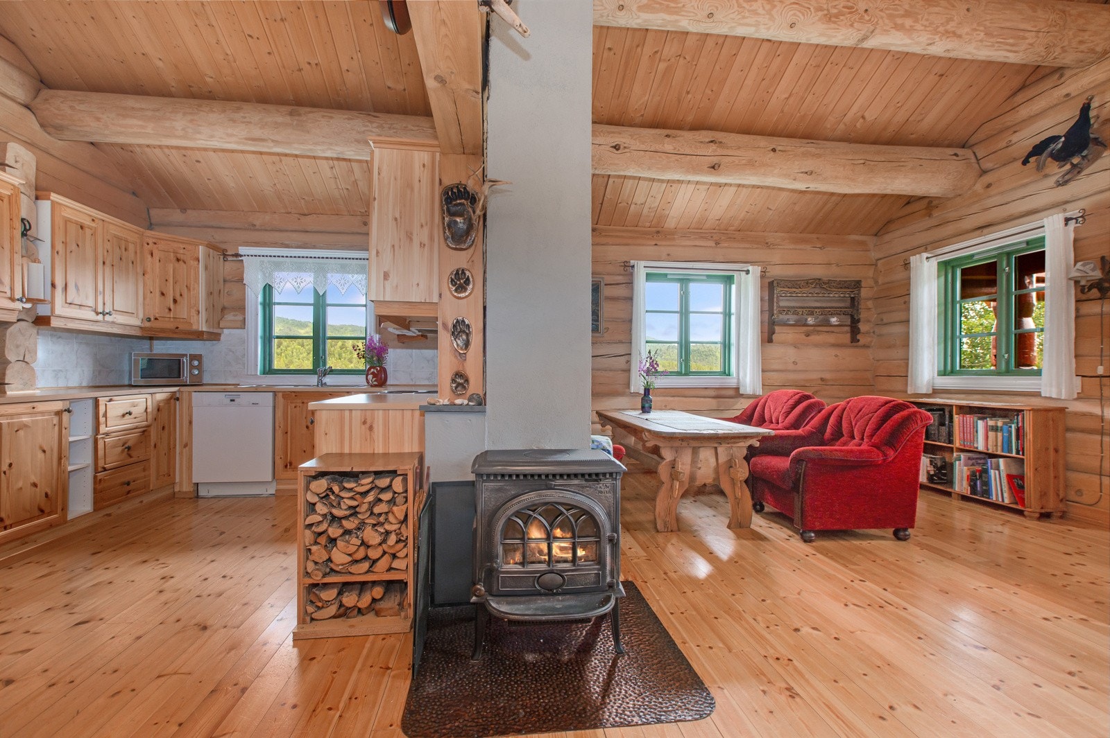Hovedbygningen ble oppført i 2003 med en god størrelse på 194 kvm P-rom i tre etasjer. Den kraftige laftekonstruksjonen passer arkitektonisk godt i landskapet, og gir bygningen et solid preg. Bygningens hovedetasje består av store oppholdsrom i form av en storstue, spisestue og kjøkken. Kjøkkenet er bygget i en åpen nisje med tilhørende spisestue, og gjennom kjøkkenvinduet sydvendt utsyn til flott fjell- og kulturlandskap. En sentralt plassert vedovn skaper et naturlig skille mellom kjøkkenavdeling og storstuen. Storstuen har lysinnslipp fra syd, vest og øst med utgang til vestvendt veranda og svalgang. Disse oppholdsrommene har en samlet god romløsning, og en flott atmosfære med den åpne himlingen, takåsene og det kraftige laftetømmeret.