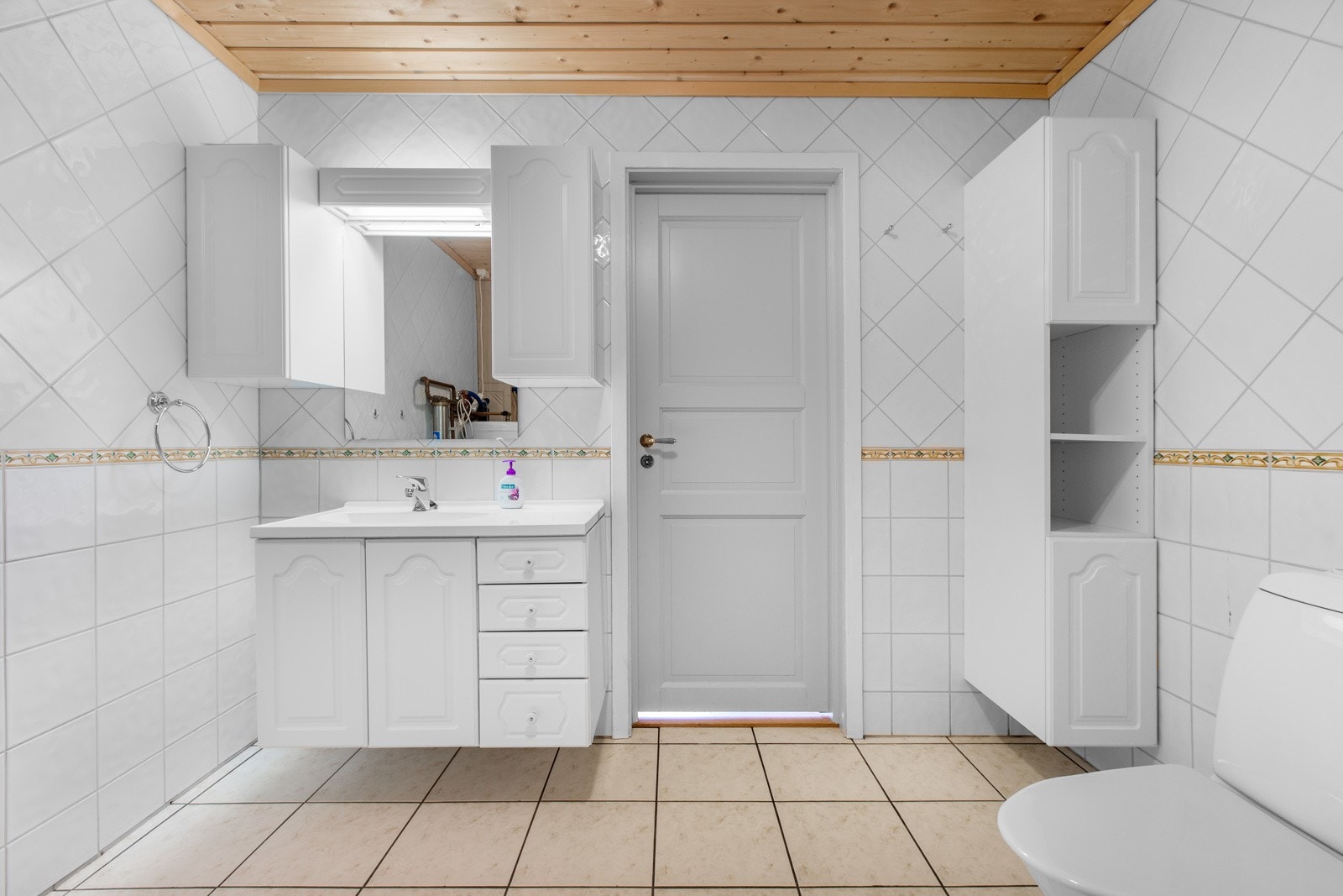Det er påvist avvik i fallforhold til sluk i forhold til krav i forskrift på byggetidspunktet. Det er mulighet for at det kan forekomme vannlekkasje på våtrommet hvor vann ikke vil gå til sluk. Målinger viser at det ikke er fall til sluk (motfall). Det er påvist at noen fliser har bom (hulrom under). Det er påvist at høydeforskjell fra topp slukrist til gulv/synlig topp membran ved dørterskel er mindre enn 25 mm. Det er påvist sprekker i fliser.