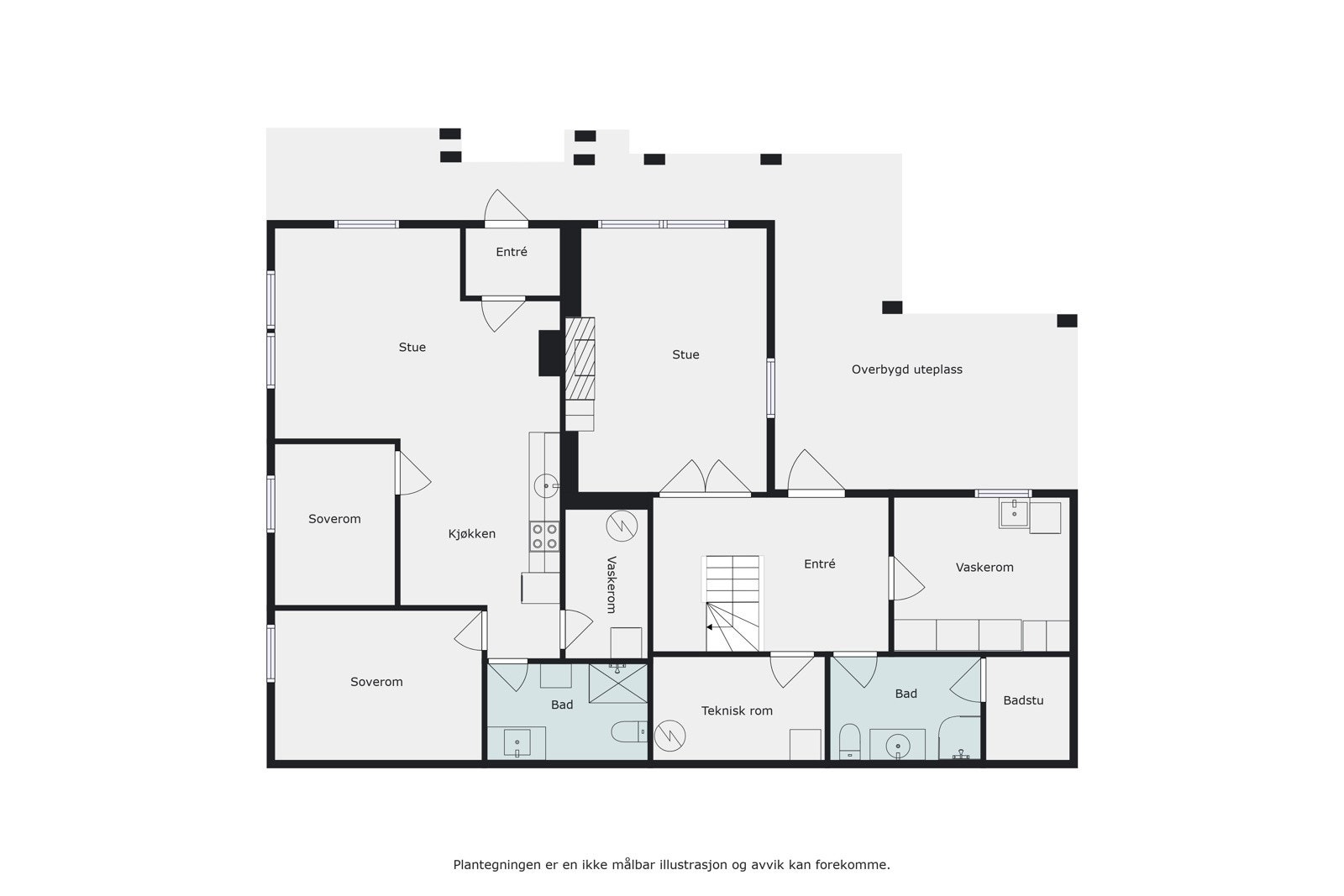Under etasje: Hall, trapperom, bad, bod, teknisk rom, Kjellerstue, Entre, –