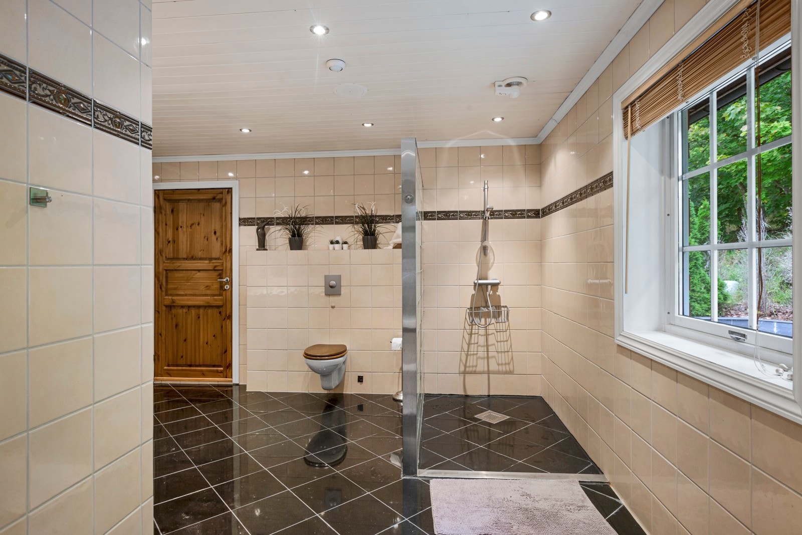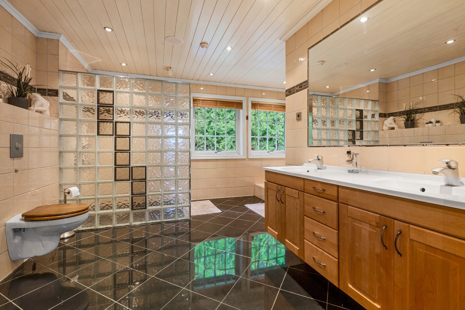 Flislagt baderom med versace fliser, gulvvarme fra byggeår. Rommet har innredning med 2 nedfelte servanter, innmurt speil med varmekabel på veggen, dette for å unngå dugg, veggmontert toalett, innebygget