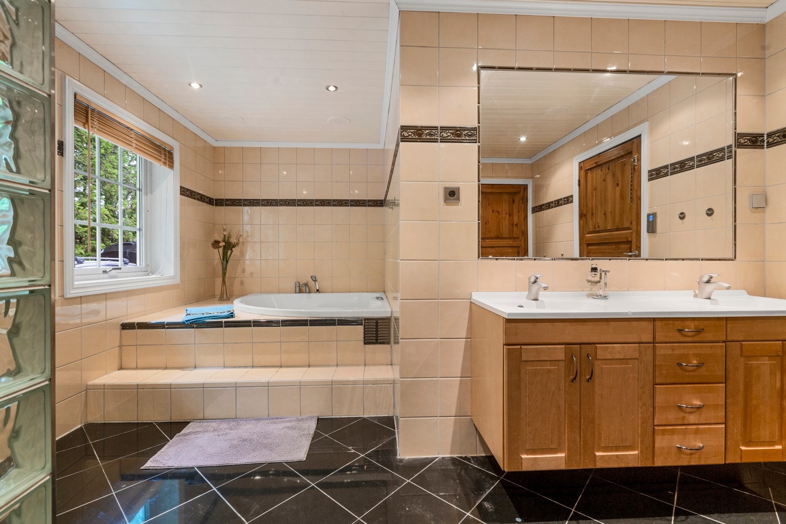 boble-badekar og dusjvegger av glassbyggerstein.