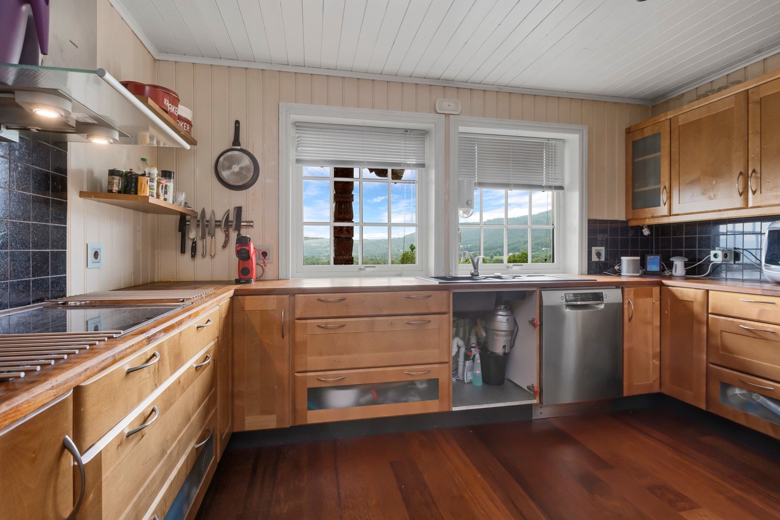 Kjøkkeninnredning fra byggeår med profilerte fronter og heltre-benkeplate. Innredningen inneholder vask m/kvern i Porsche design, opplegg for vaskemaskin og kjøleskap, og integrerte hvitevarer (platetopp og komfyr).