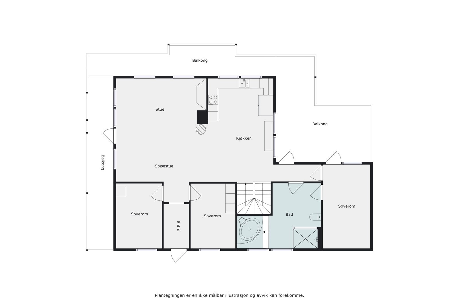Leilighet, stue/kjøkken, Teknisk rom, bad, 2 soverom.