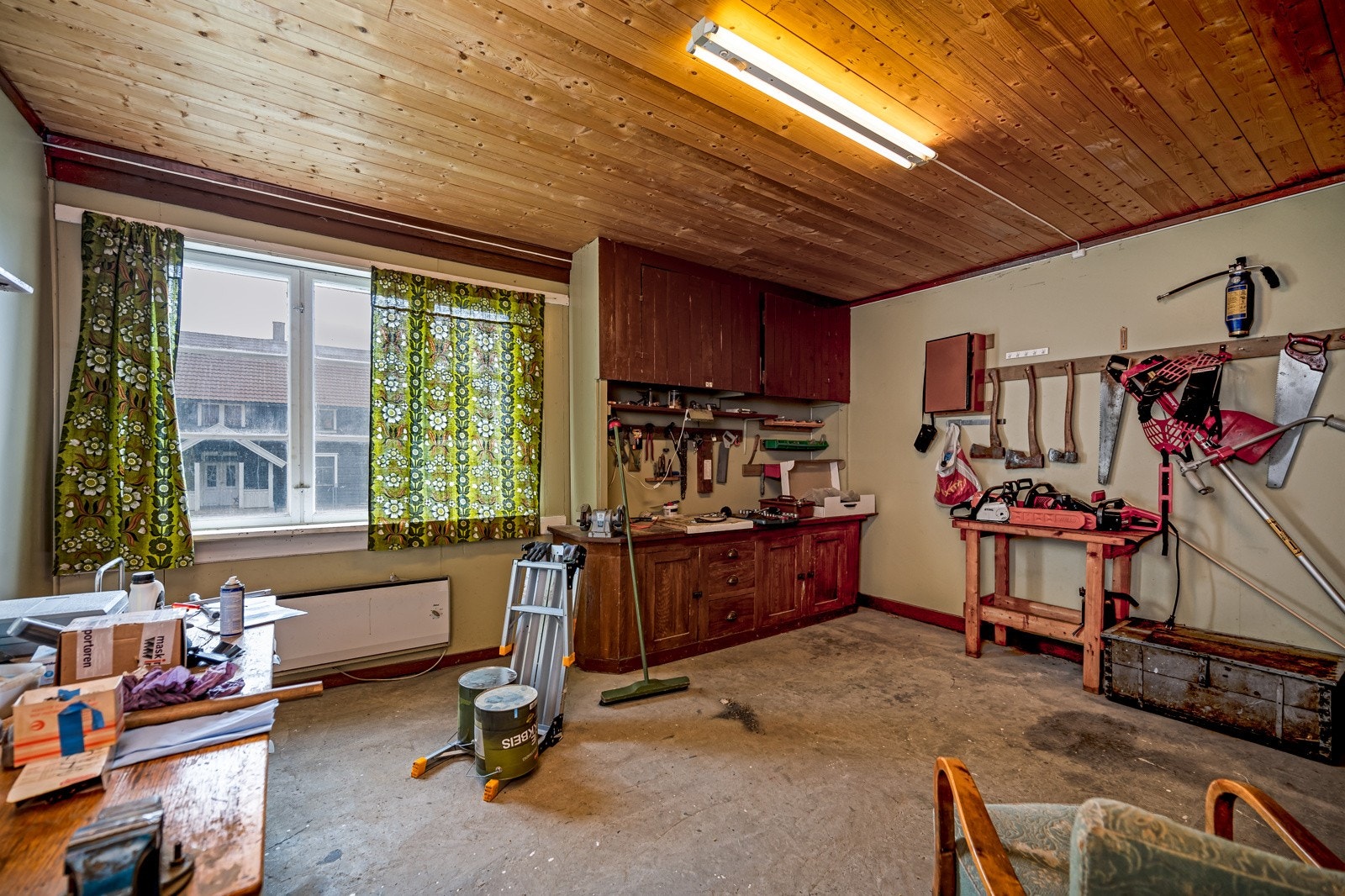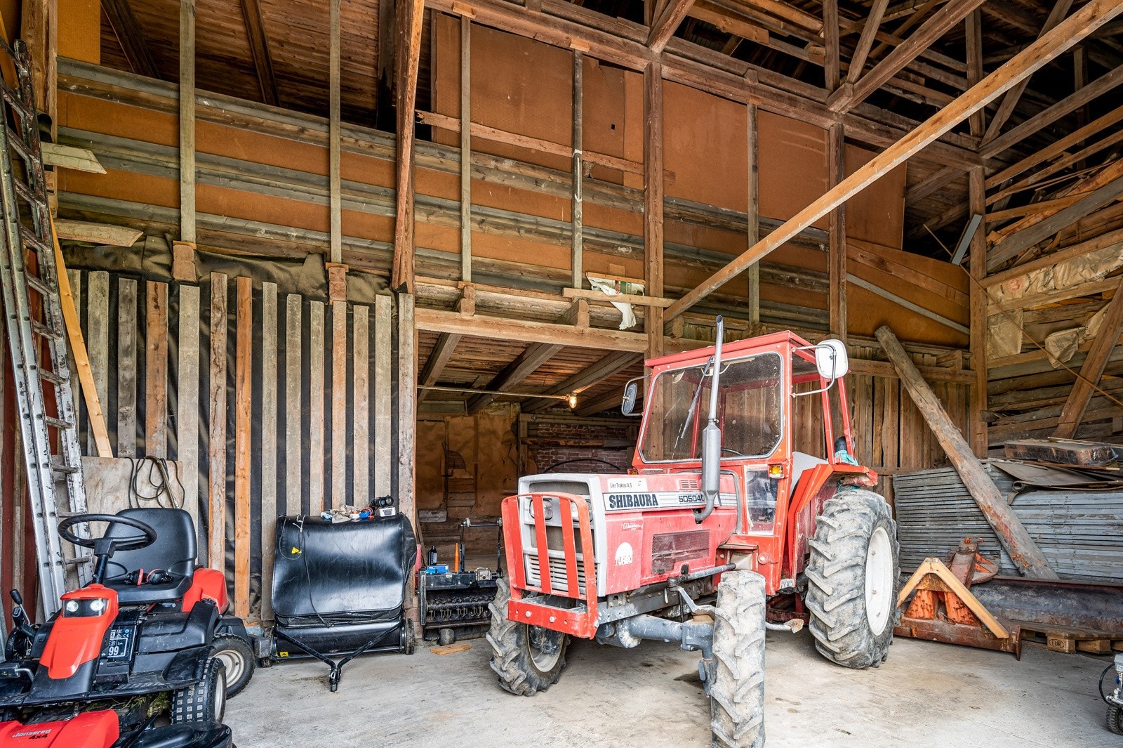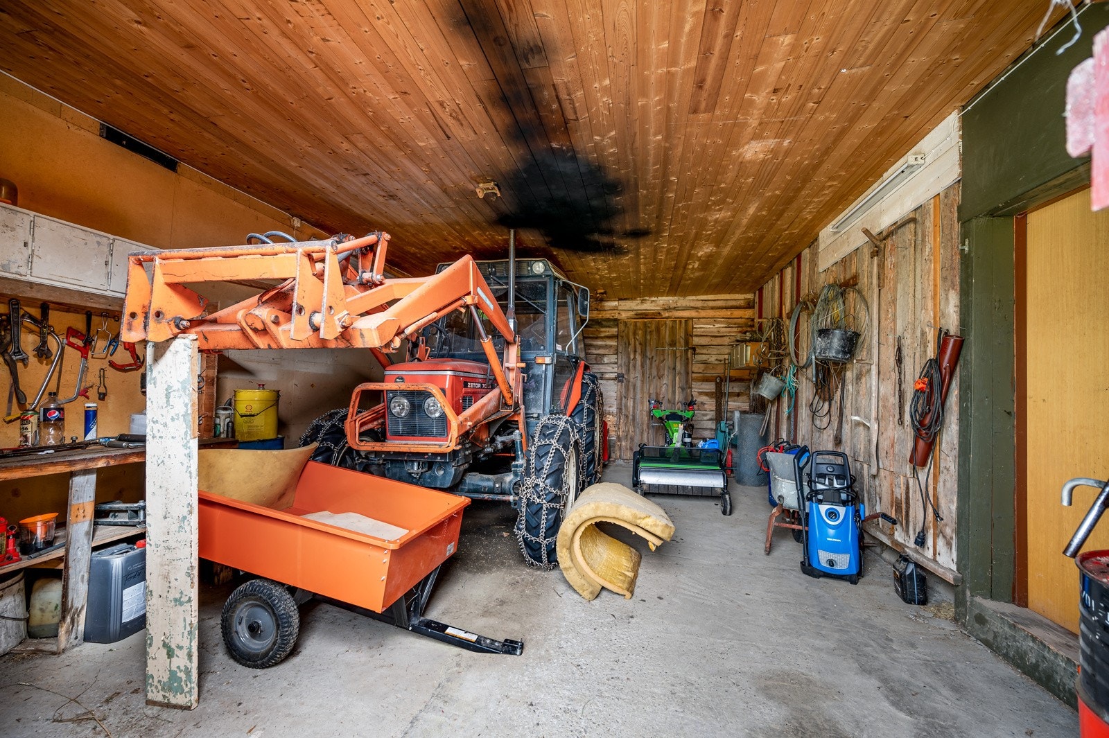 for landbruksredskap og andre maskiner, isolert og oppvarmet snekkerrom, verksted med enkle