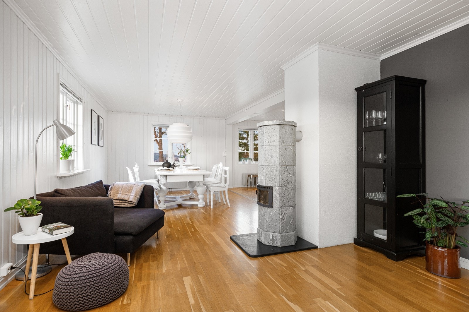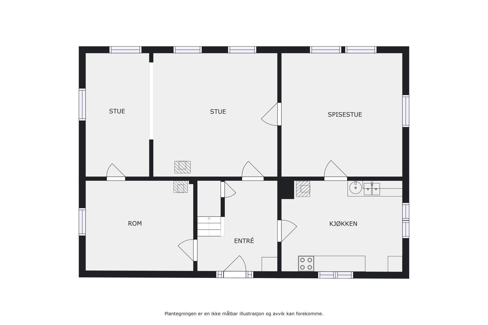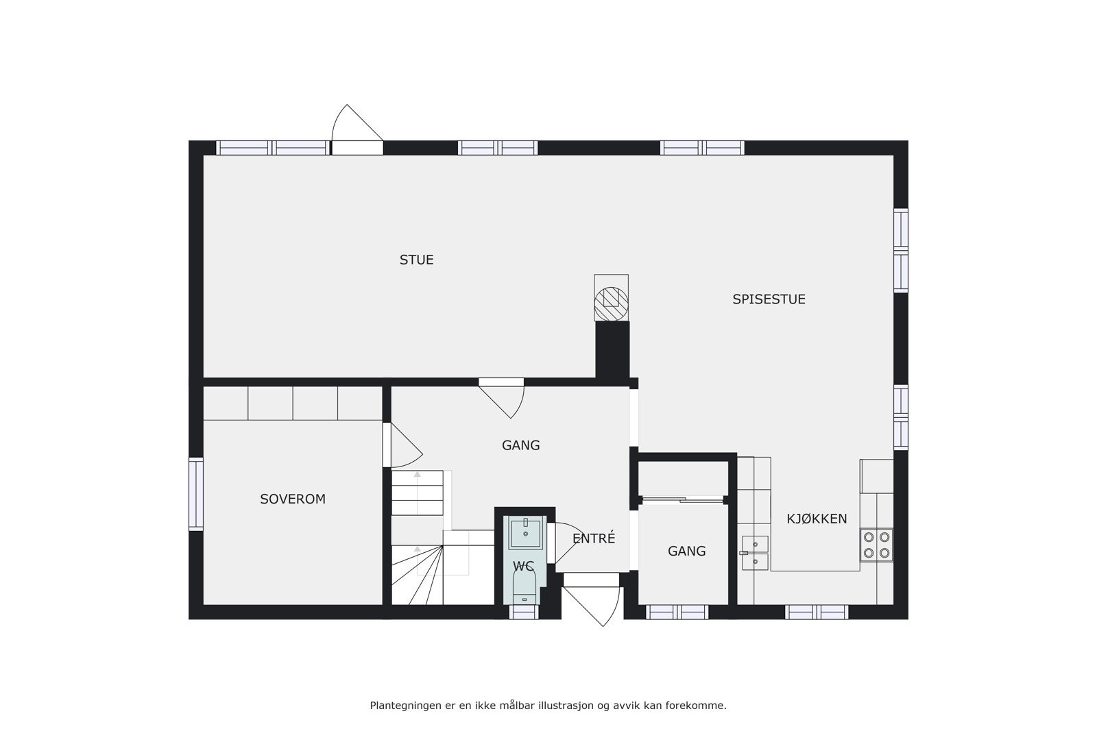 Boligens planløsning er tidsriktig og man har i tillegg full kjeller i bygningen. Første etasje består av et stort åpent kjøkken- og allrom med tilhørende spisestue. Det er videre direkte adgang til boligens dagligstue hvor det er plassert en flott klebersteinsovn sentralt i rommet. Fra stuen er det lagt opp til at man skal ha adgang til sydvestvendt terrasse, men selve uteplassen er ikke bygget utover at man har pukket opp klargjort grunnen. Øvrige rom i etasjen består av hovedentré med garderobe og trappeadkomst til andre etasje, separat wc og et hovedsoverom av god størrelse.
