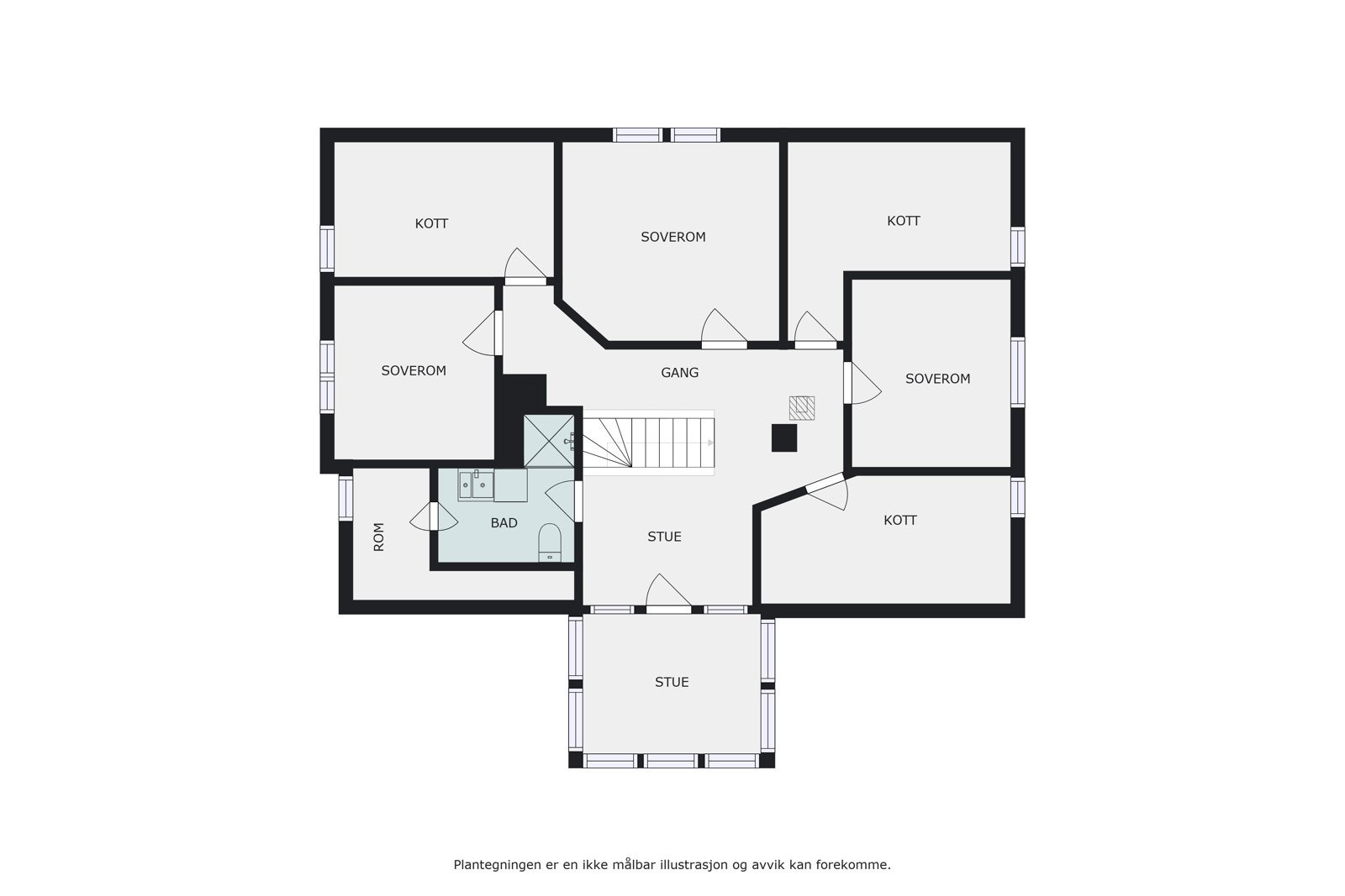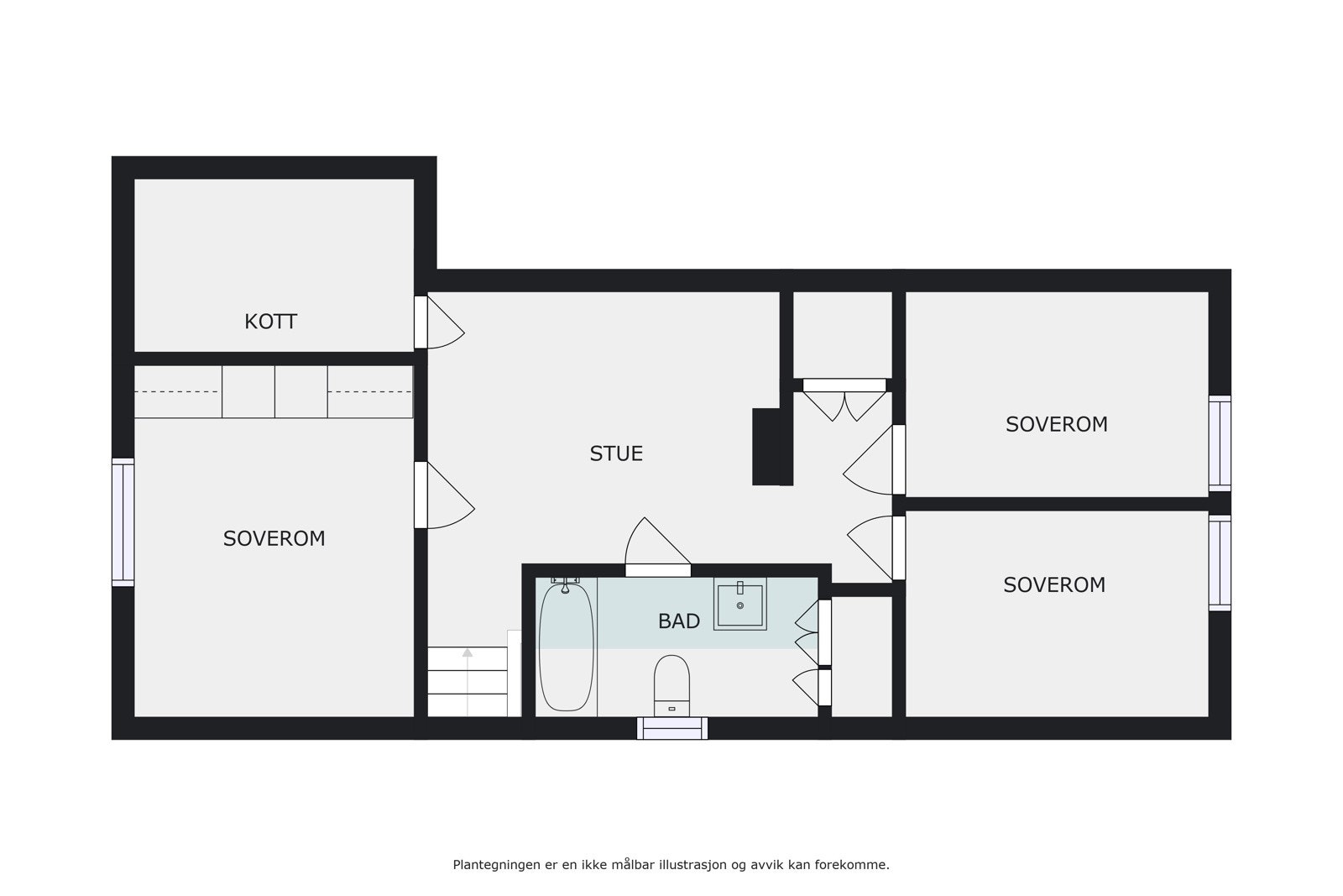 2. etasje primærrom: Trapperom/stue, bad og tre soverom.