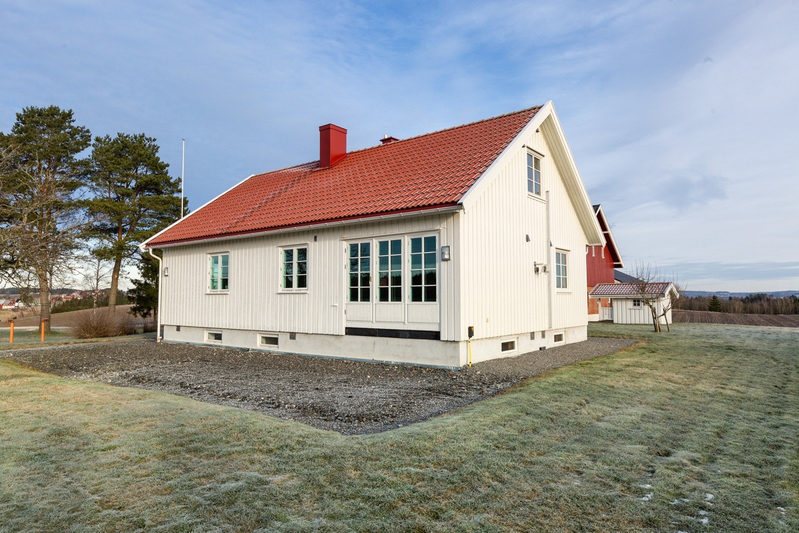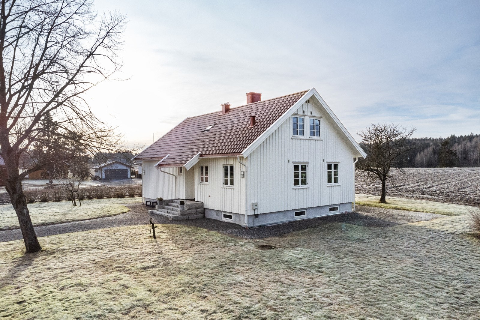 Våningshuset er oppført i 1976. Bygningen er antatt fundamentert på leirholdige masser med støpt plate og grunnmur i lettklinker. Grunnmuren er utvendig drenert med rør, isolasjon mot mur, grunnmursplast og kantbeslag. Det er observert noen skråriss i grunnmur. Yttervegger i isolert bindingsverk fra byggeår som er utvendig kledd med stående malt bordkledning. Deler av kledningen er værslitt og oppsprukket. Bygningen har utvendige dører i malt treverk og malte trevinduer med 2-lags glass og enkelte vinder med koblet glass. Flere av vinduene er skiftet ut i 2003, 2006, 2007 og 2022. Det er observert slitasje på vinduskarmer og også på dørkarmer. Taket er bygget i saltakskonstruksjon med A-takstoler/tresperrer og er isolert mot oppholdsrom. Det er for dårlig lufting av kaldtloftet og enkelte takgjennomføringer har påvist avvik. Utvendig er taket tekket med betongtakstein som ble omlagt i 2009. Renner, nedløp og beslag er også fra 2009.