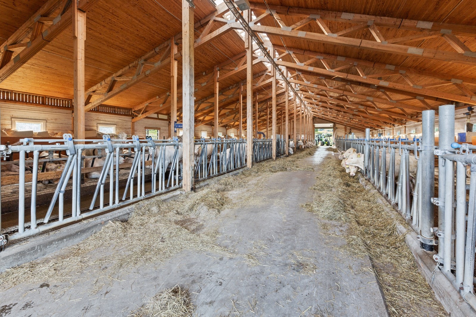 Fjøsdel og stall er delvis oppført i tømmer og betongvegger, utvendig kledd med stående trekledning,