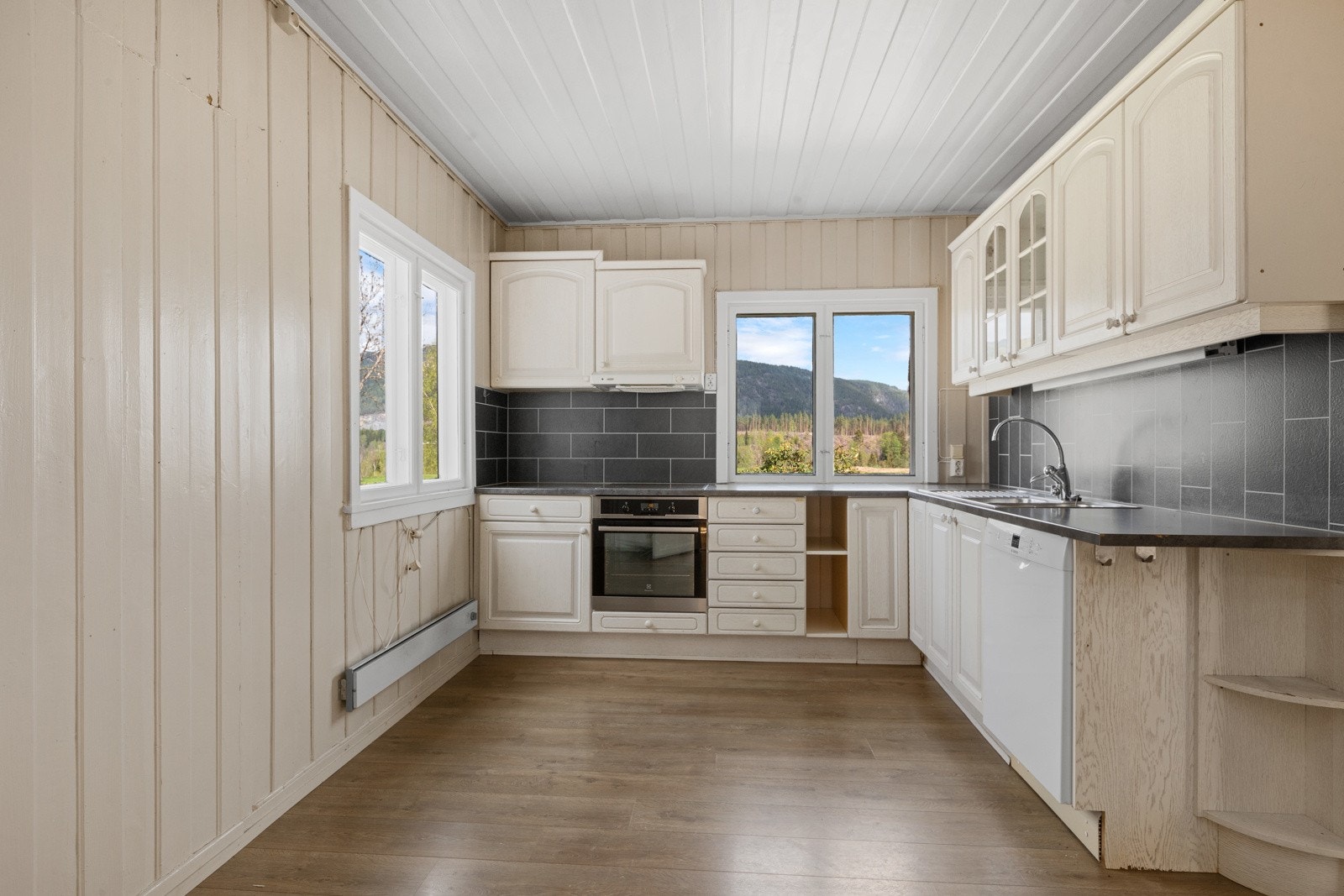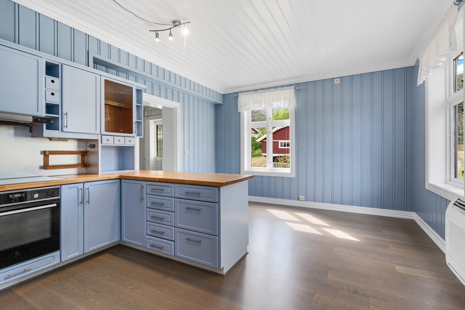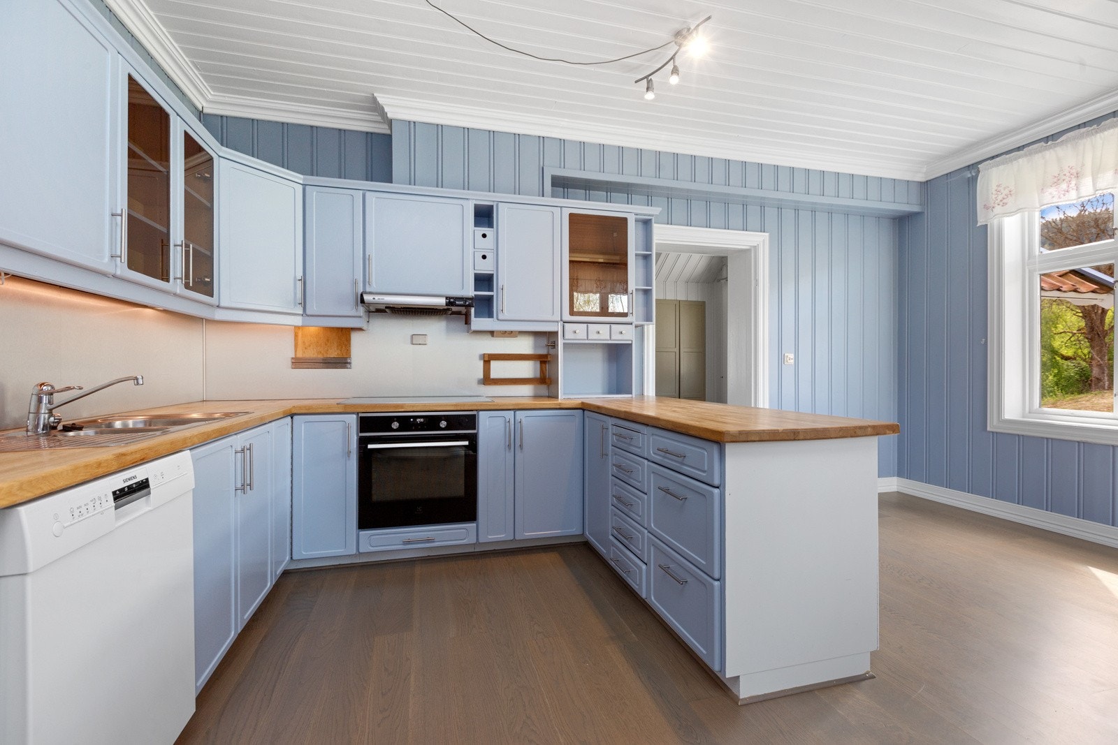 Kjøkkeninnredning fra 1990, fabrikkframstilt type med finerskrog og profilerte dører og skuffer. Heltre eik benkeplate med nedfelt servant. Nedfelt induksjon platetopp 80cm med montert vifte over. Enkelte overskap har glassdører.
