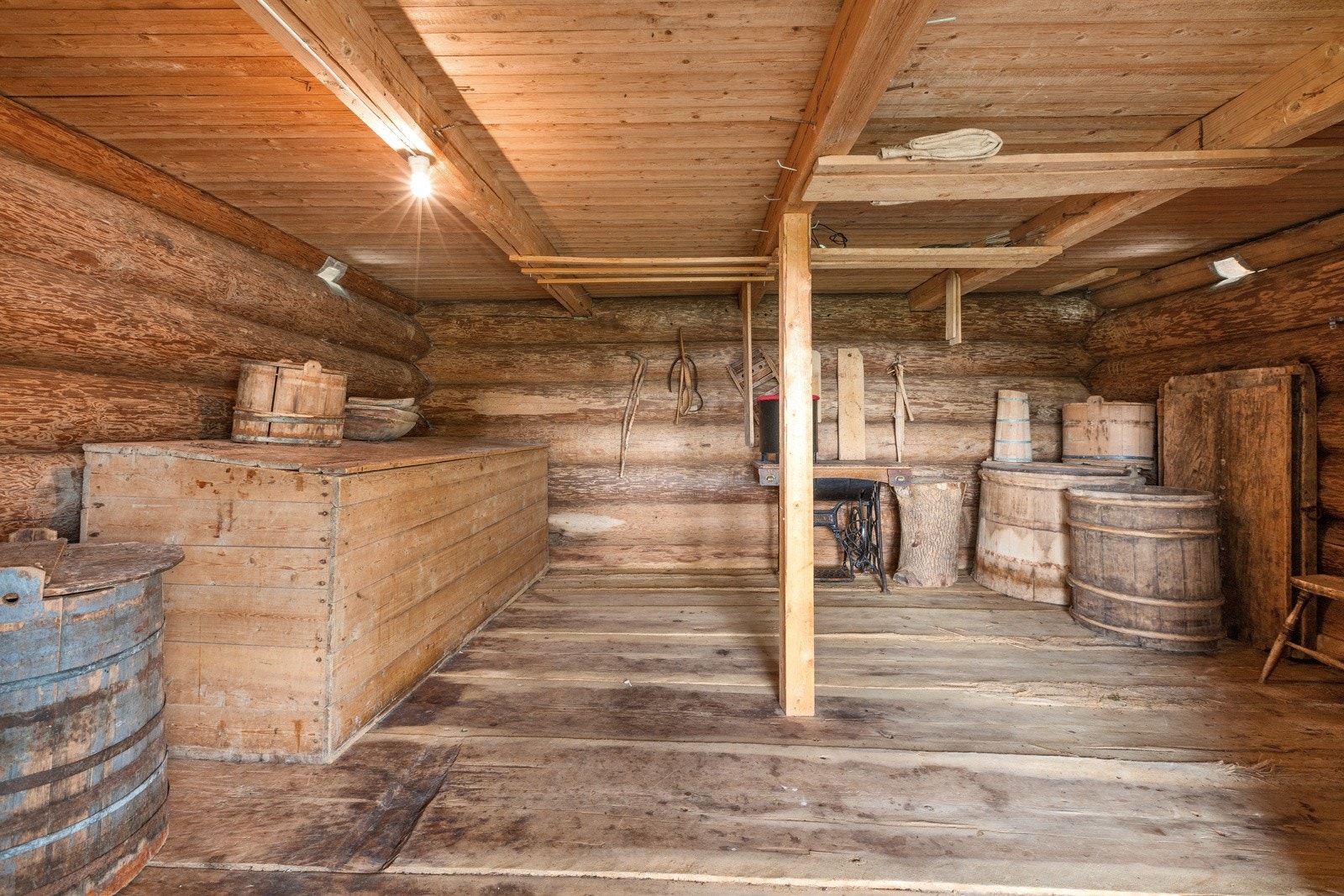 Innvendig tregulv, vegger med laft og åpen konstruksjon, himling med åpen konstruksjon. Innlagt strøm.