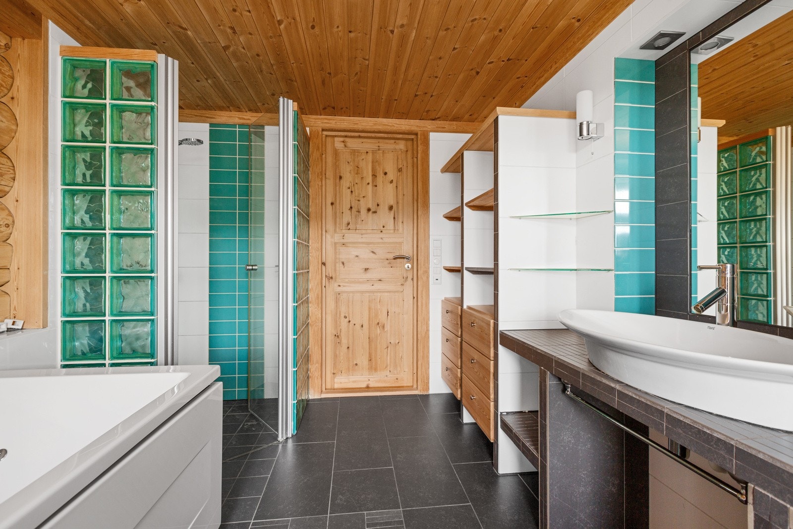 Bad oppbygd rundt 2013 med betongglattet gulv, pålagt varmekabler og keramiske fliser. Vegger med delvis keramiske fliser med innslag av laftet tømmer. Himling med trepanel. Det er montert en plassbygd innredning som er forblendet med fliser, montert servant, veggmontert servant, badekar samt