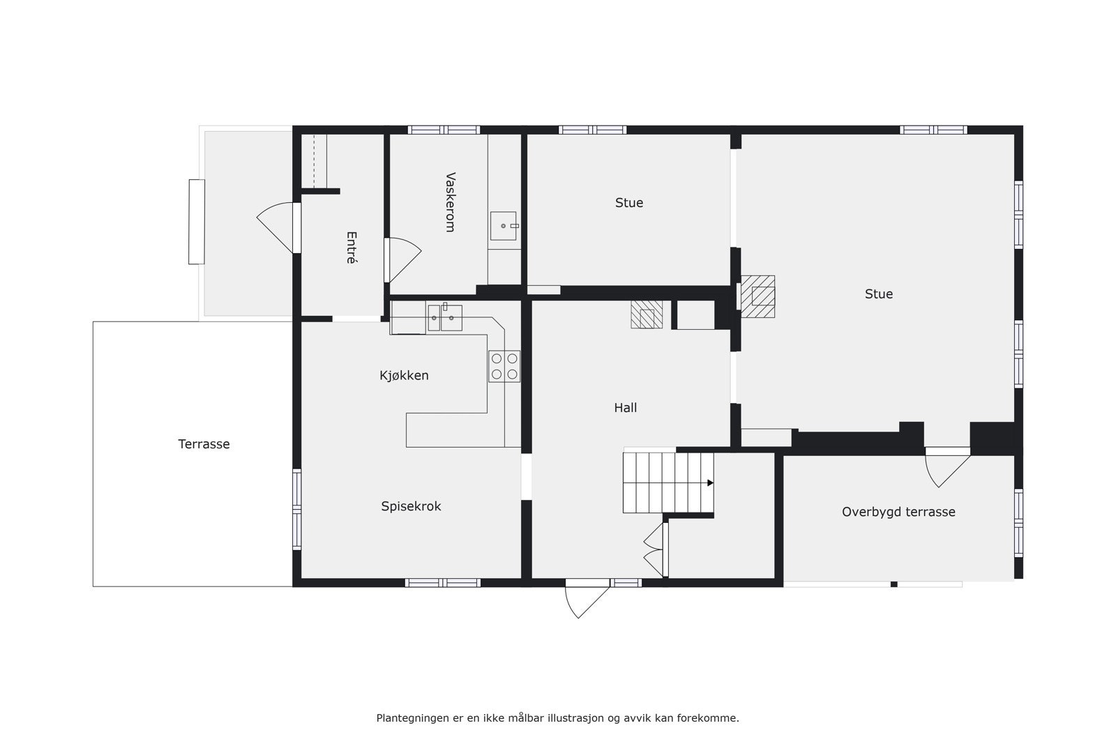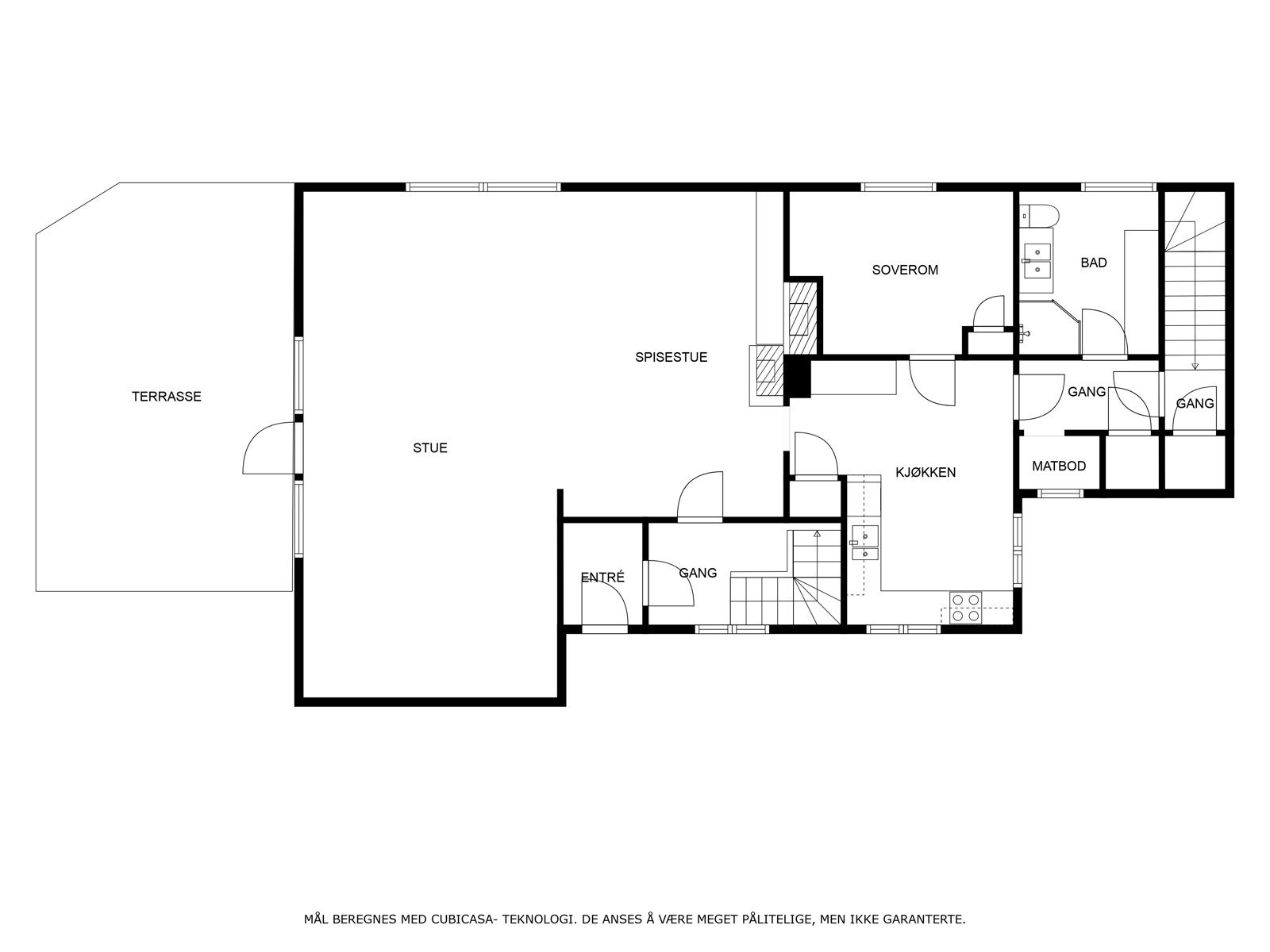 1.etg: Gang, vaskerom med wc, kjøkken, mellomgang med trapp og dør ut, Stue med utgang til terrasse.