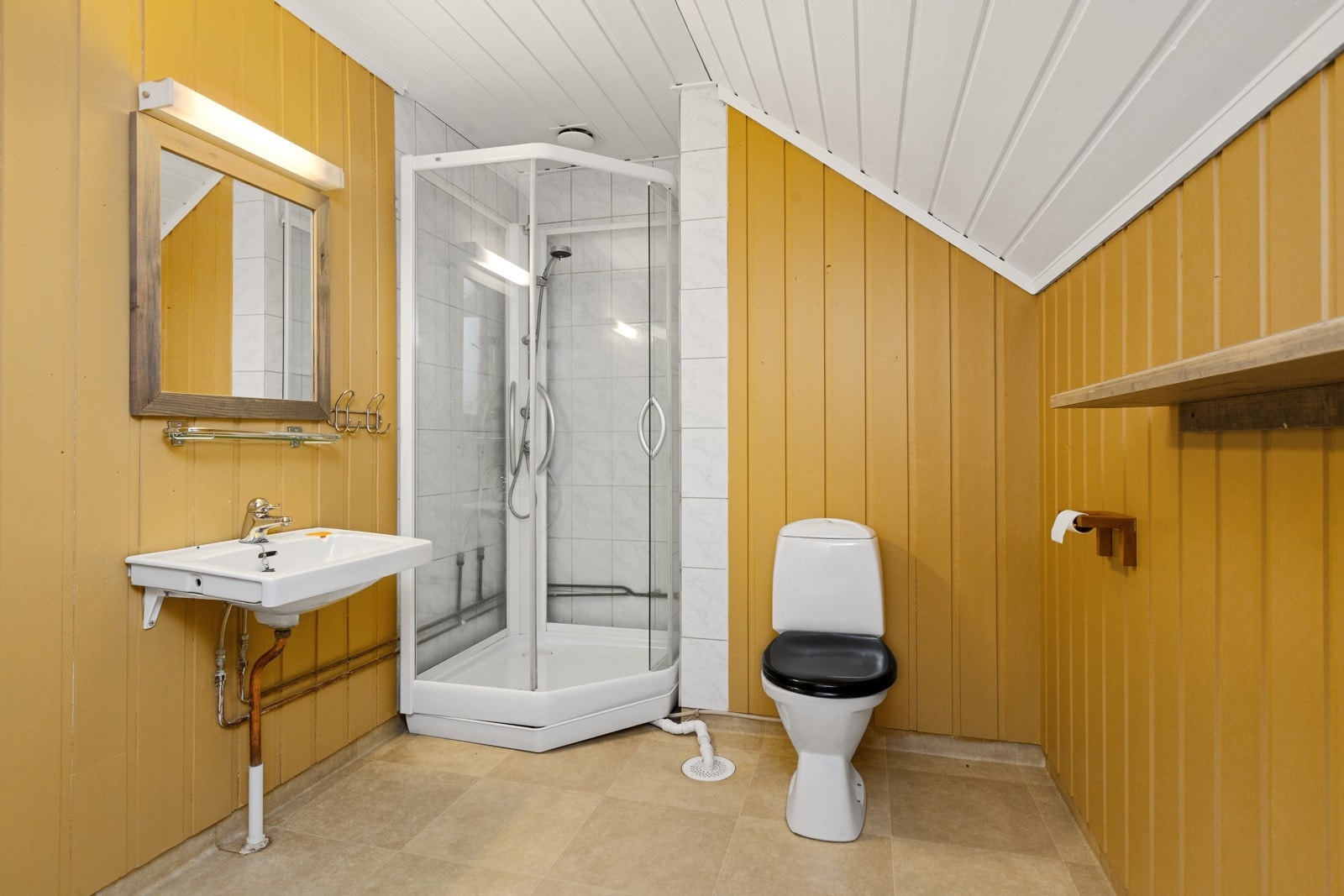 Bad antatt fra rundt 2013 med belegg på gulv. Vegger med malt trepanel, bak dusjkabinett er det keramiske fliser. Himlinger med malt trepanel. Gulvmontert toalett, servant og dusjkabinett. Det er montert stråleovn. Sluk i gulv. Flere plassbygde knekott og lagringsskap med slette dører.