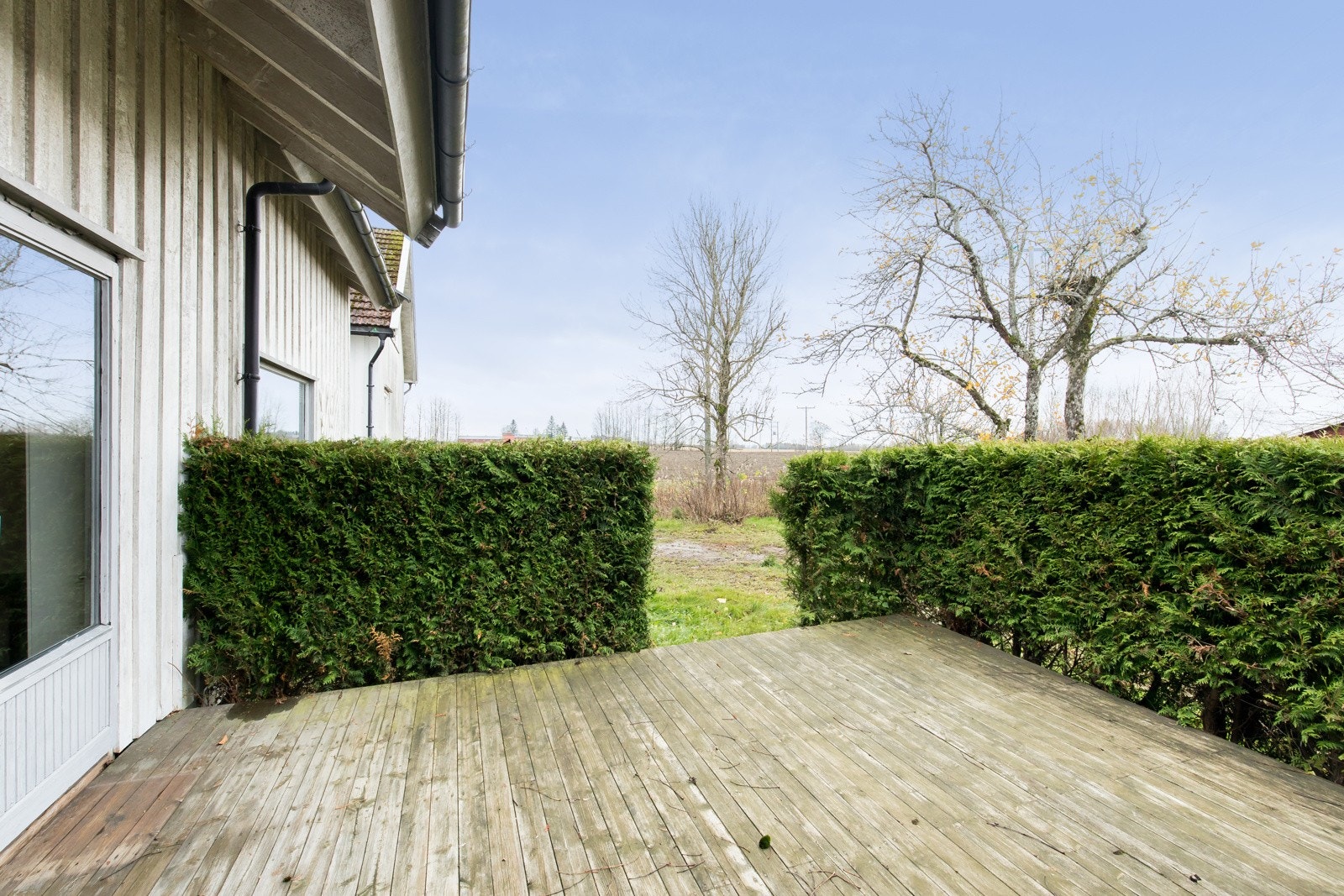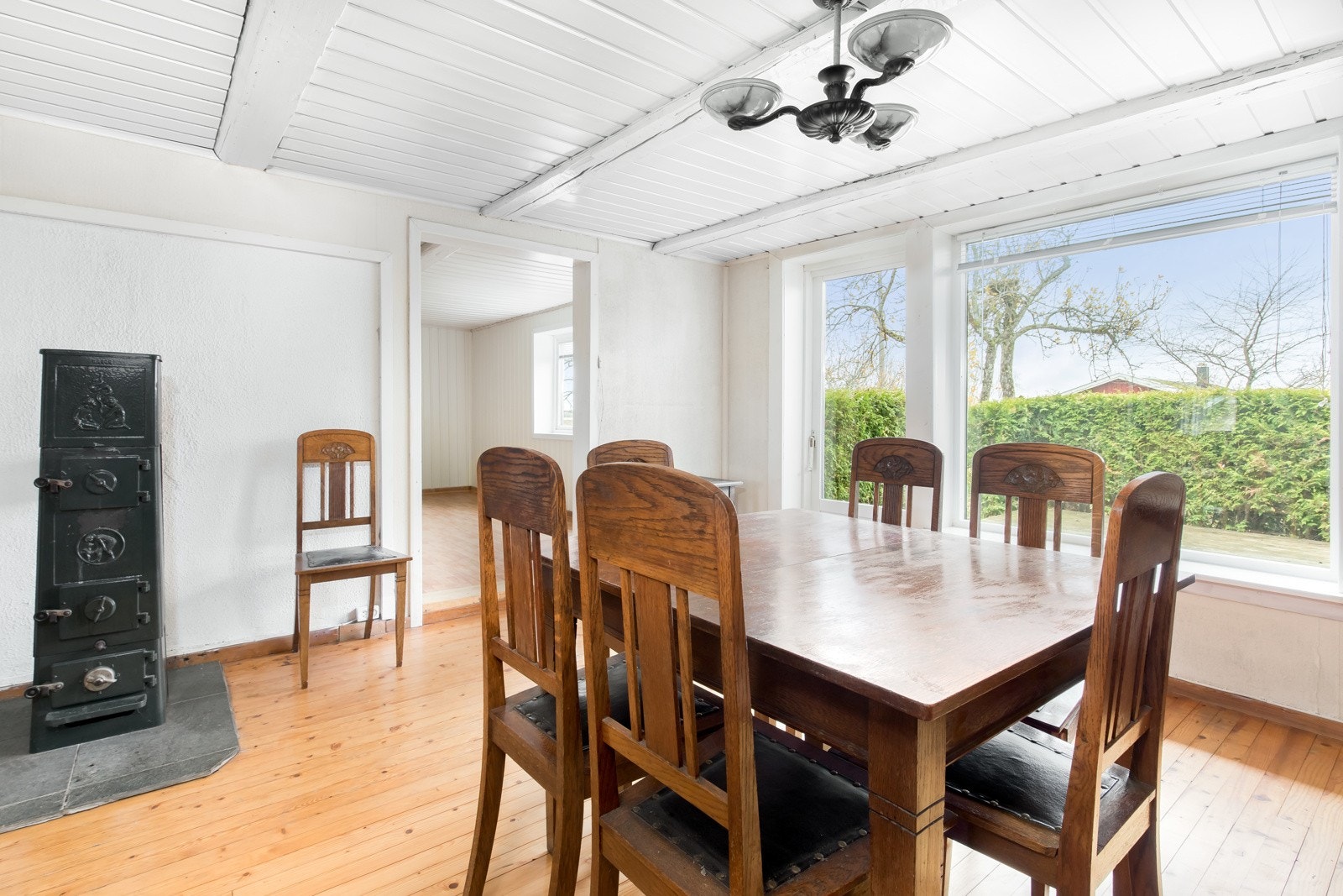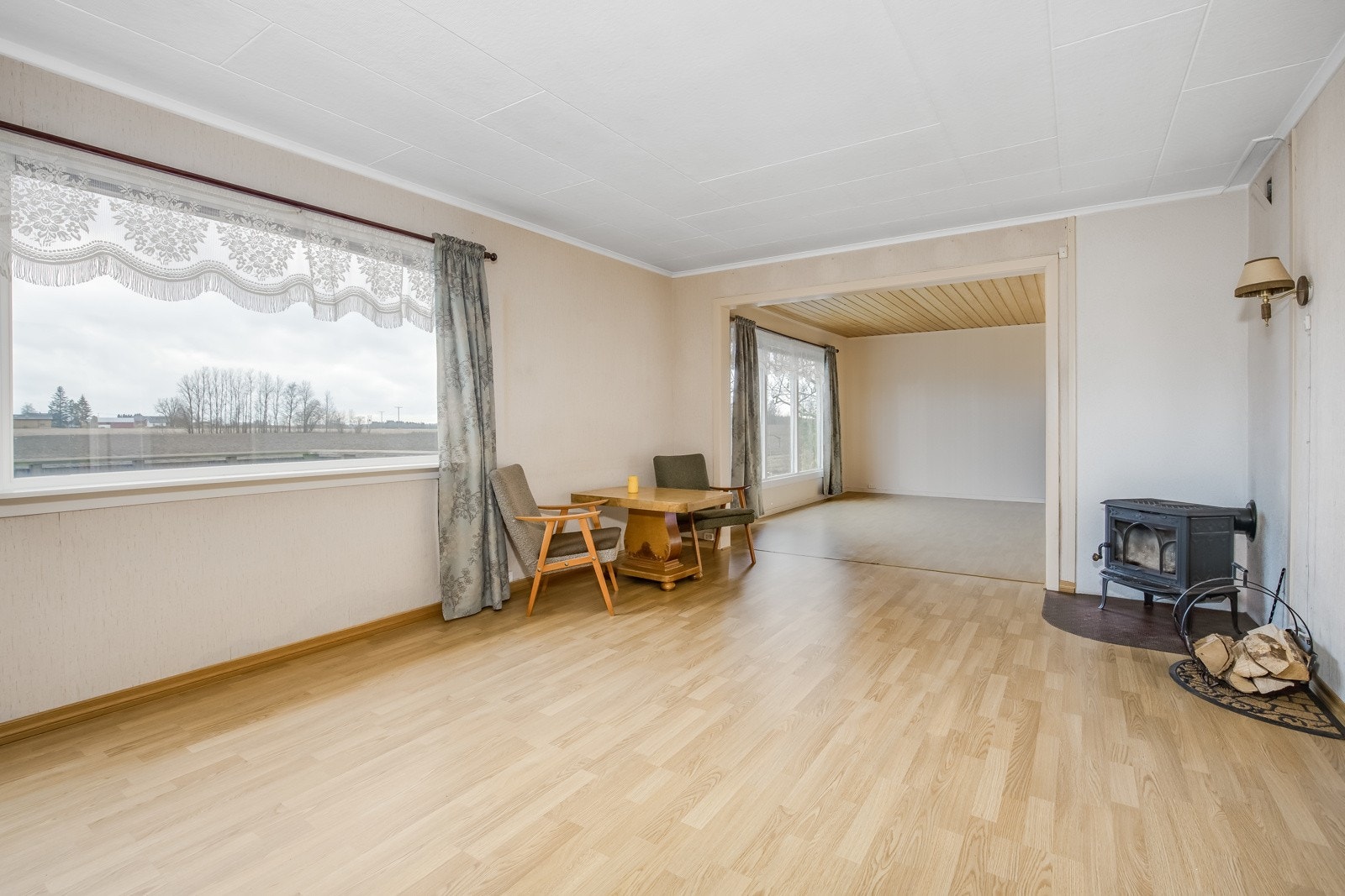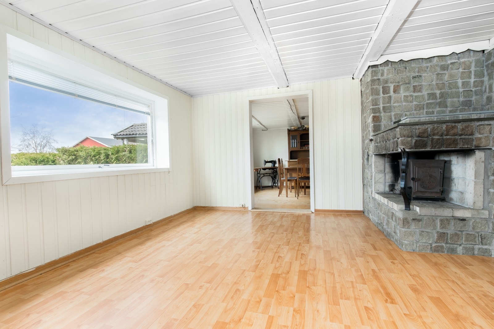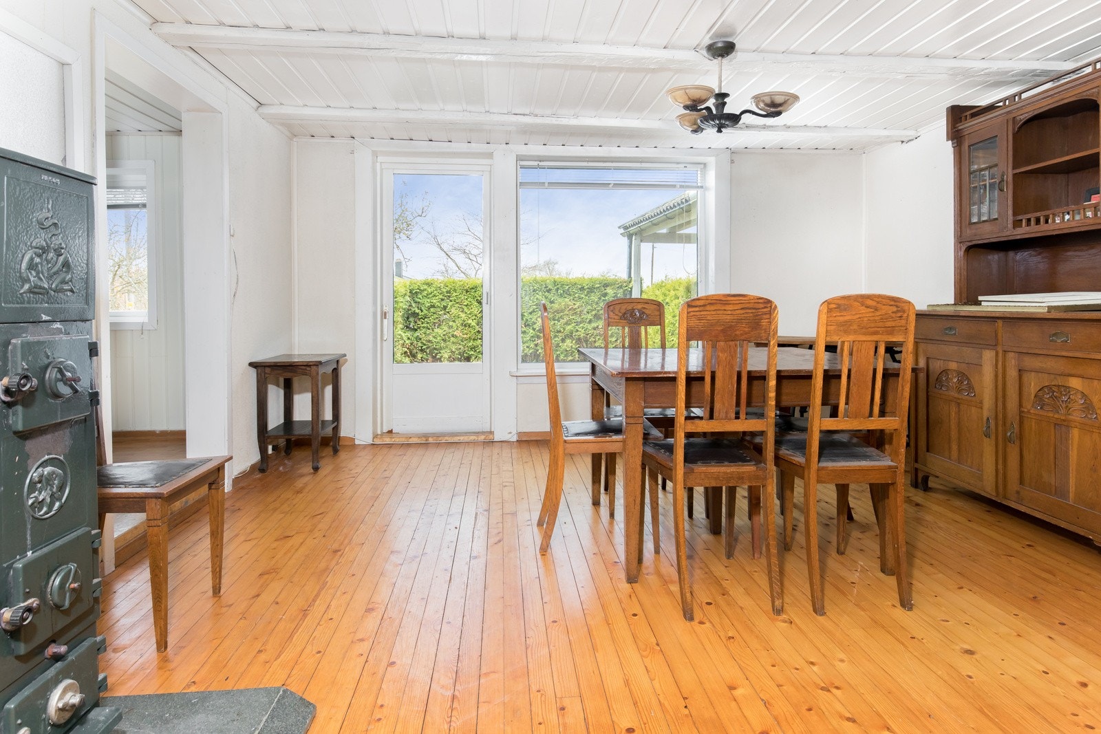 utgang til delvis overbygget uteplass og videre ut i hagen - salongstue med vedovn.