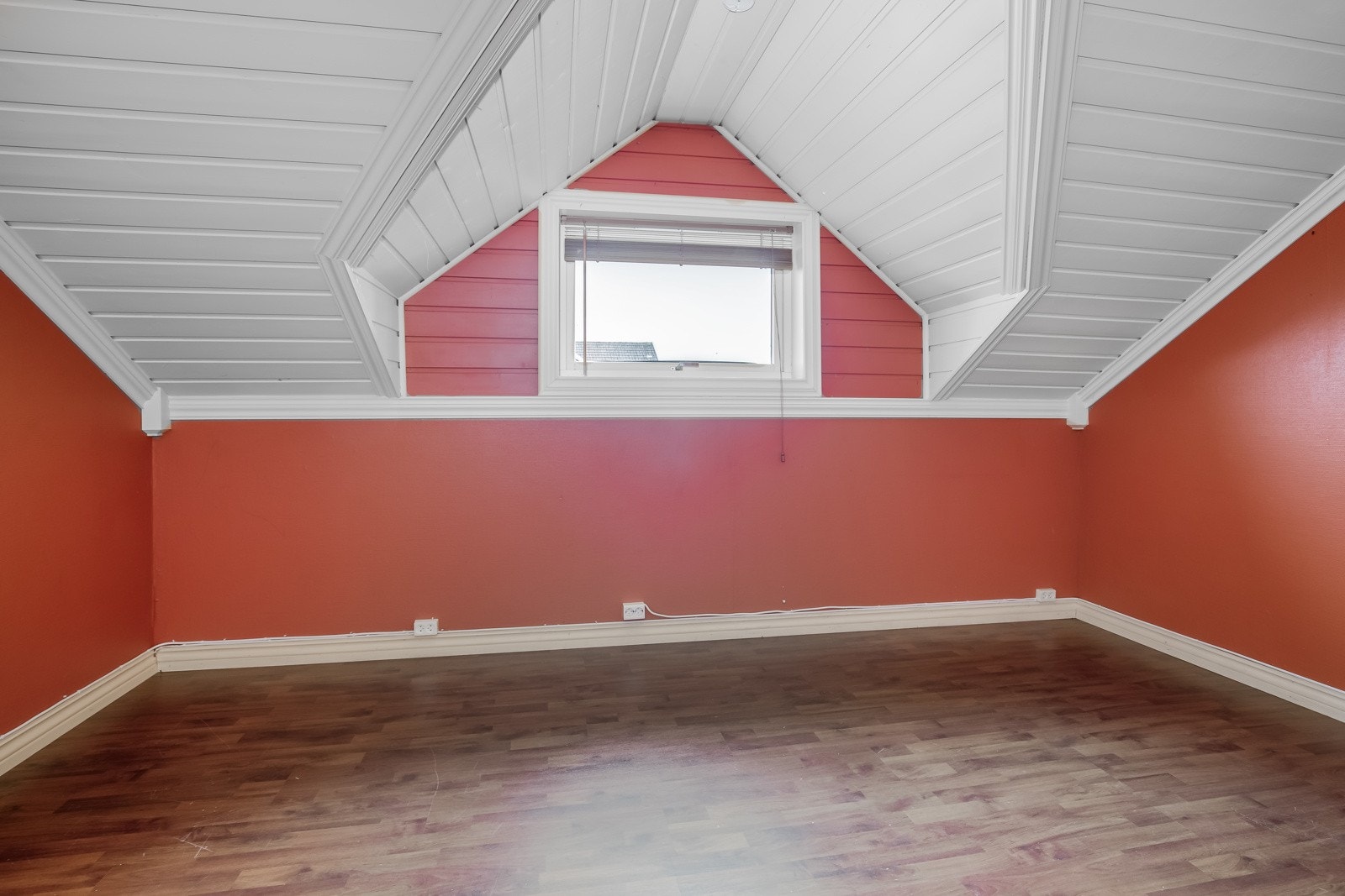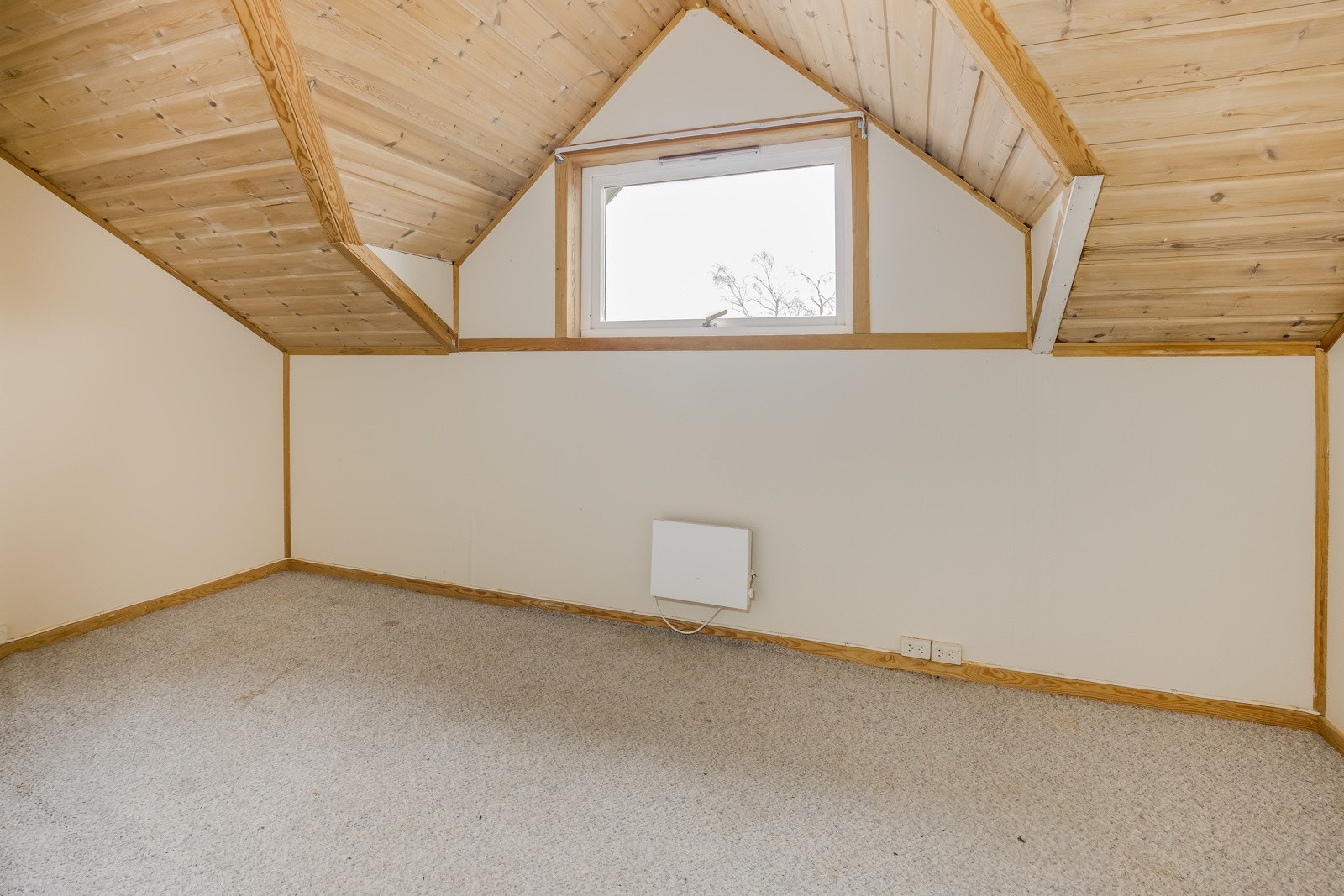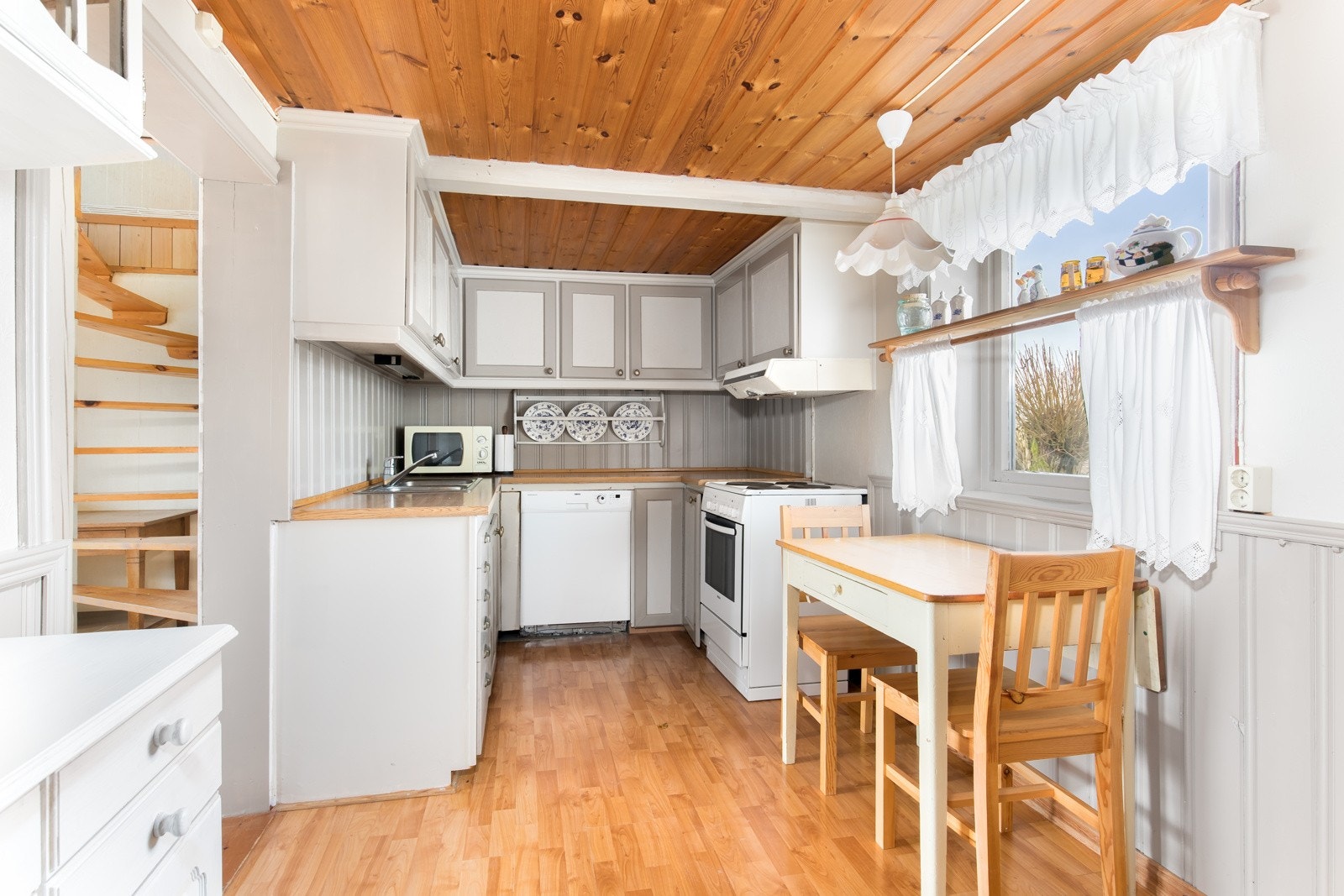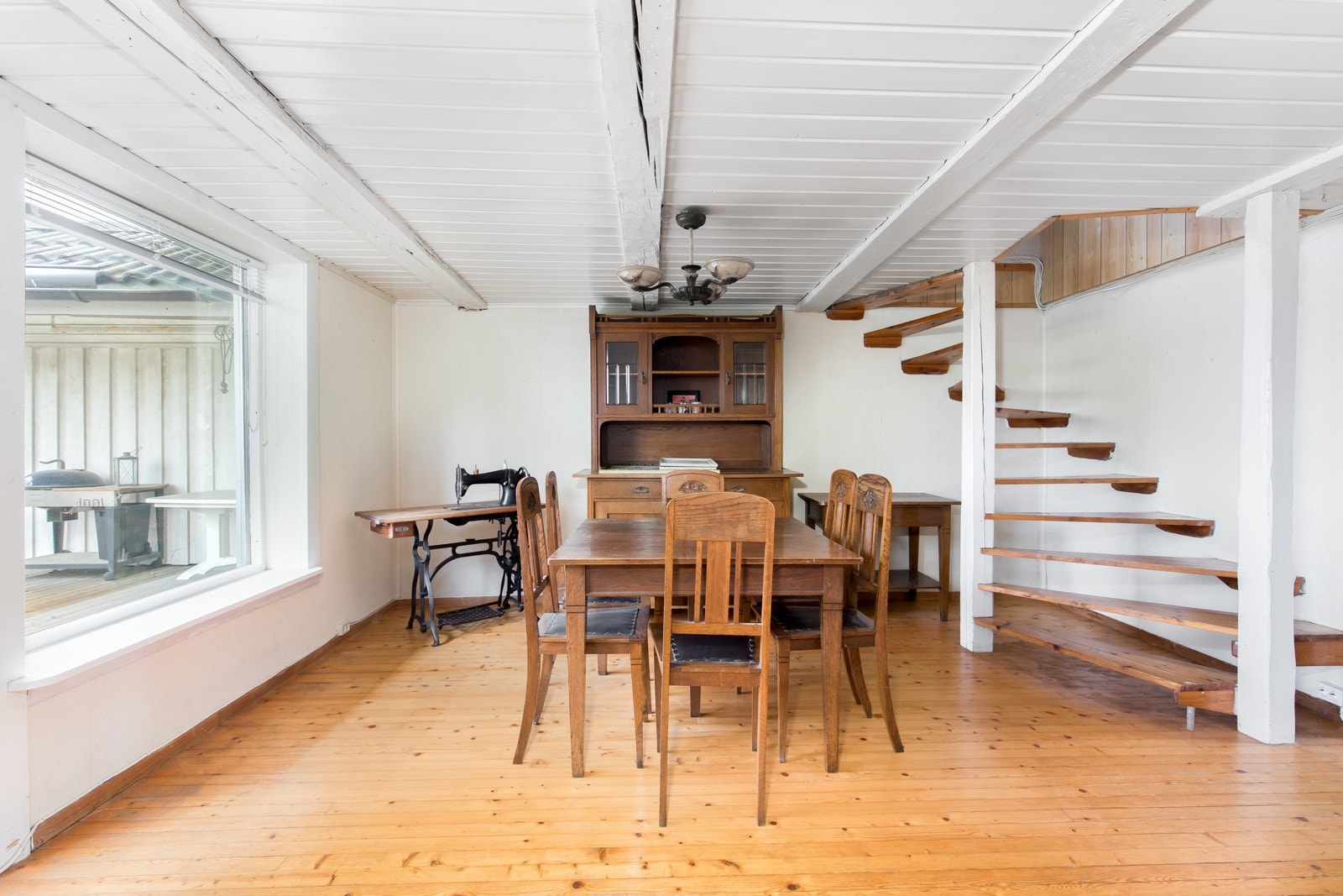 Er på en flate og inneholder to rom med lagringshems over det ene rommet.