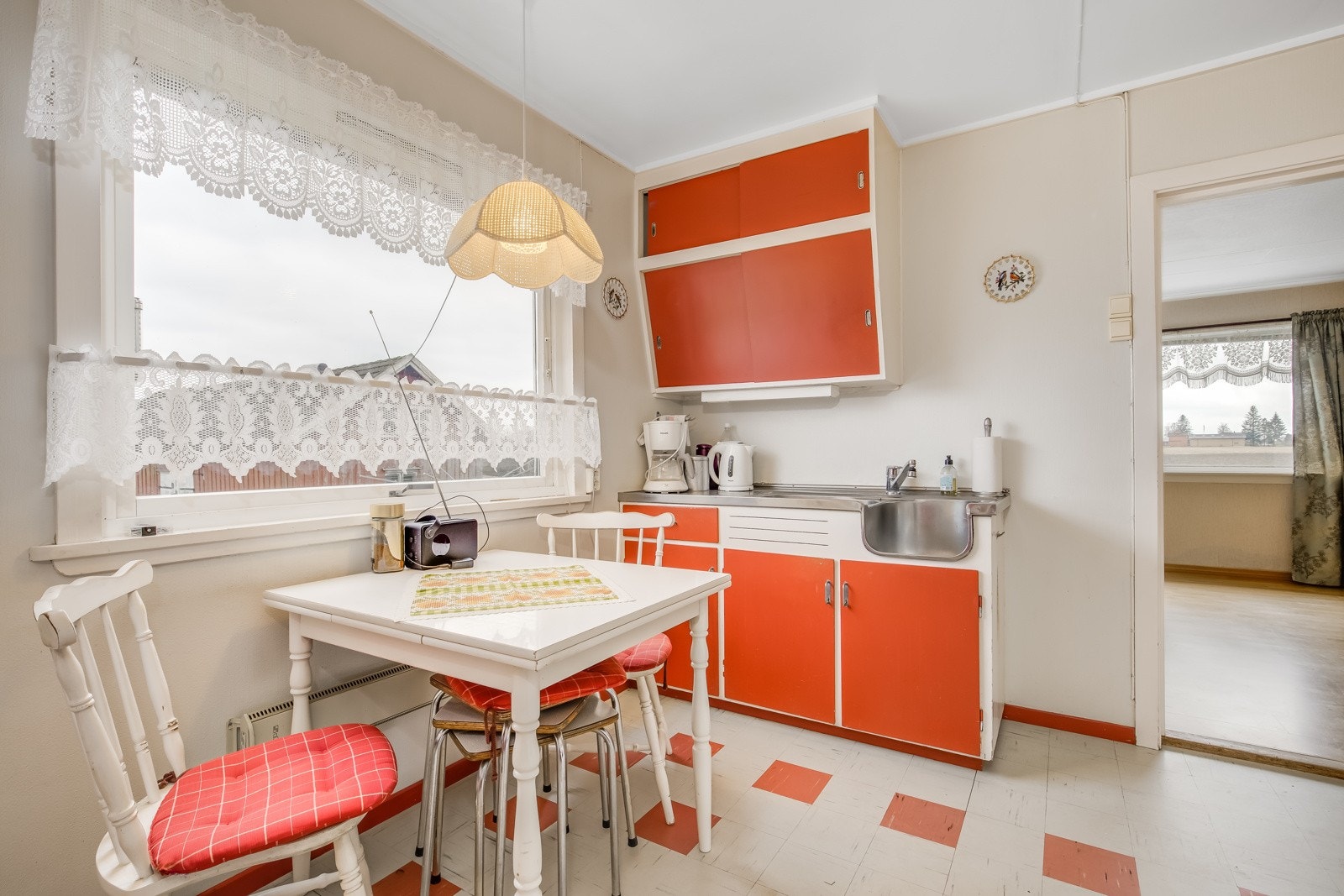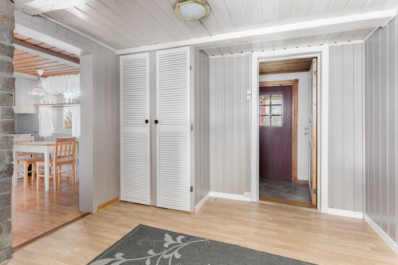 Vindfang med garderobeplass - gang .- dusjbad/wc - kjøkken med liten spiseplass - spisestue med