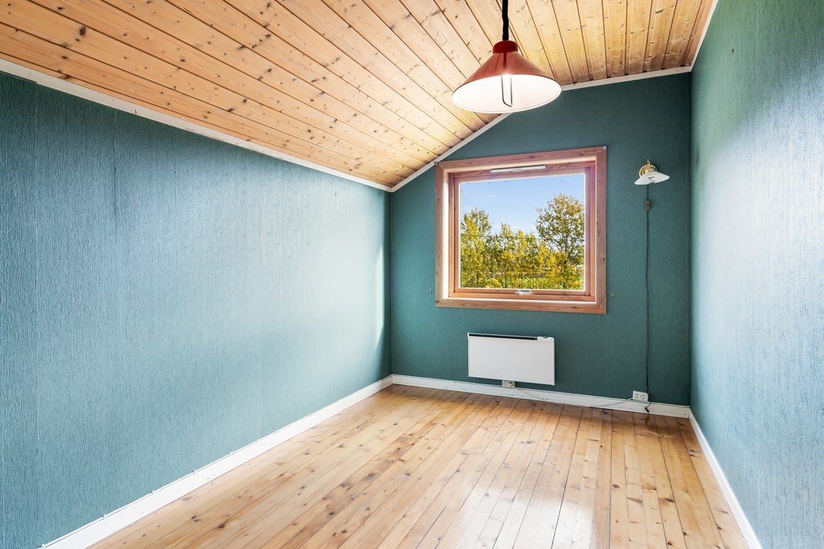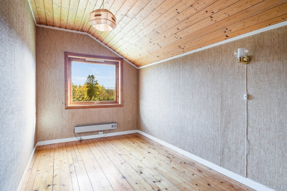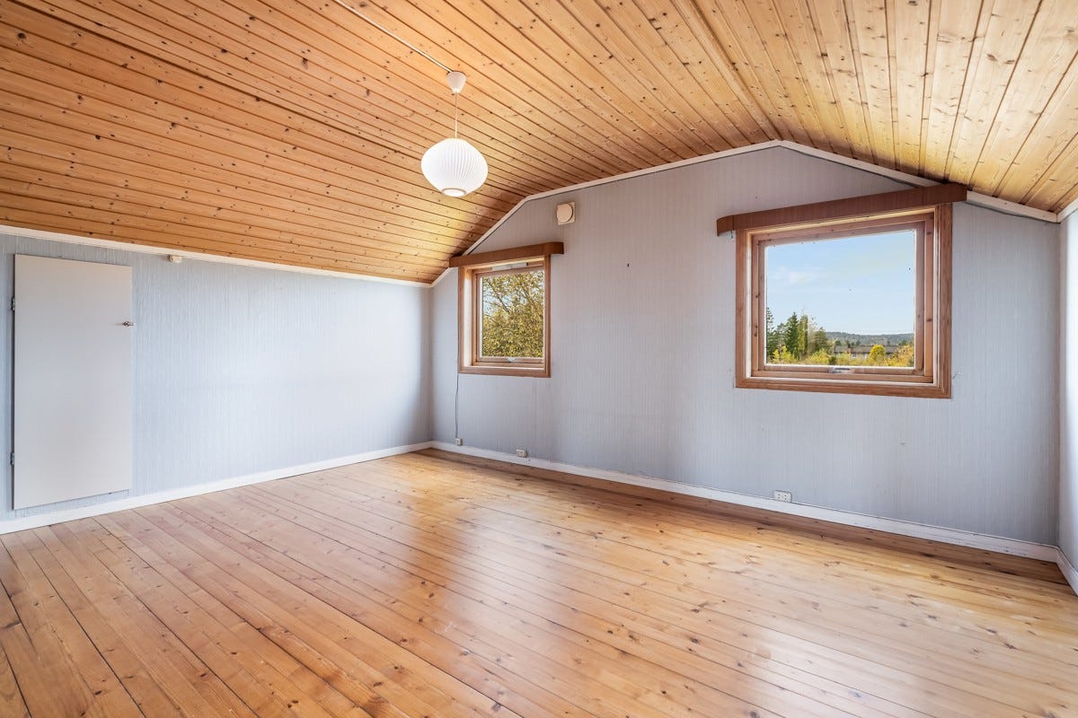 servant, hovedsoverom og 2 barnesoverom. God lagring i kneloft på begge sider. Loft med adkomst fra