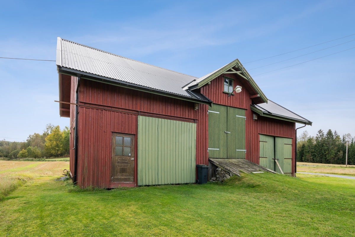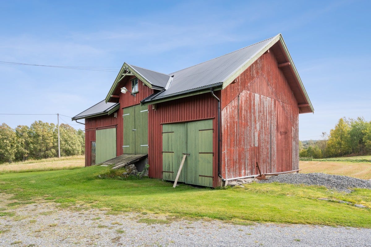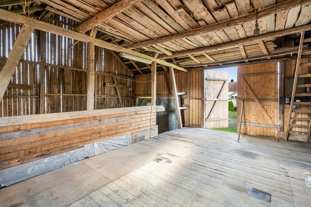 skyvedørsport av stå samt en egen dør. Svingdører til traktorgarasje. Eldre låvebru av tre med adkomst