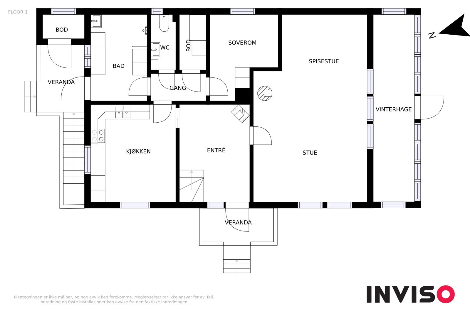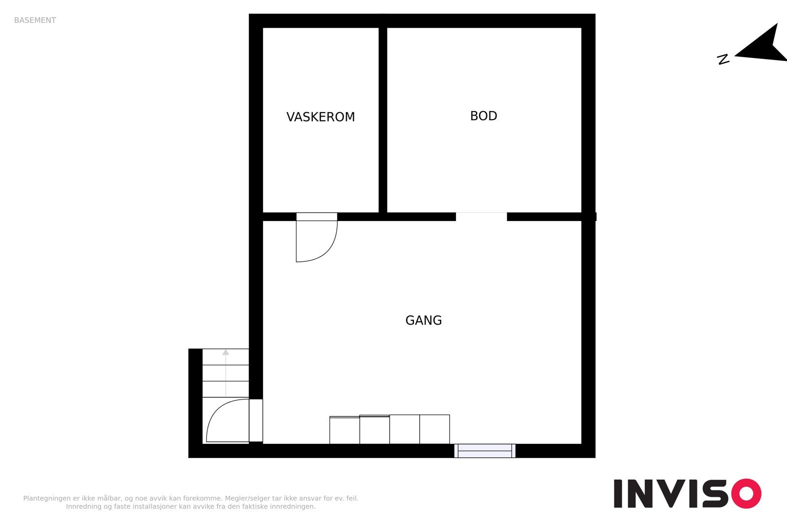 kvm, vendt mot syd, med tilgang fra hagen. Det er lagt betongheller mot grunnen. Vegger er oppført i