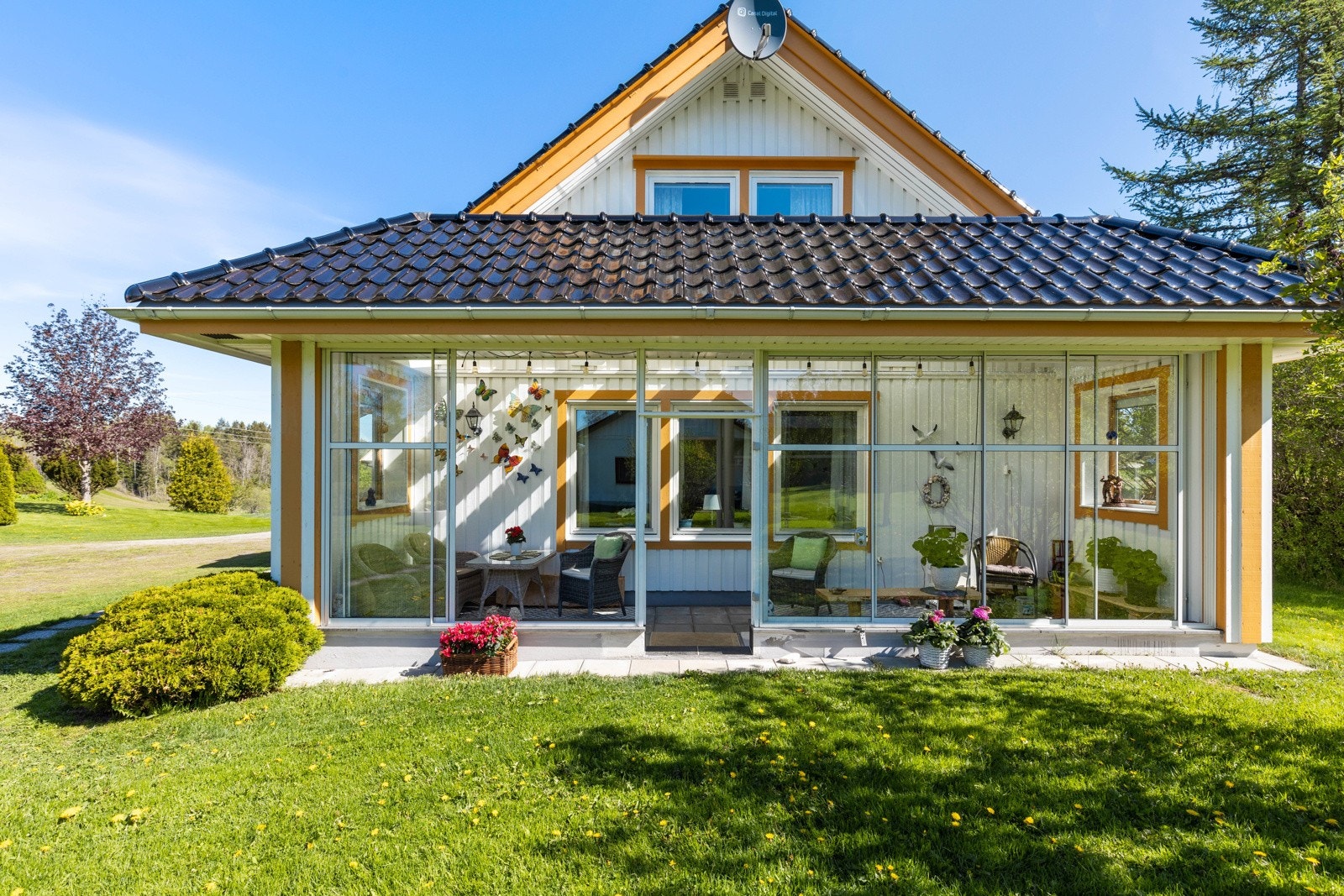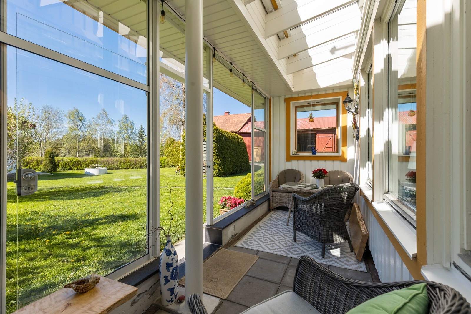 bindingsverk samt skyvbare glassfelt. Deler av taket er innglasset. Det er montert stikkontakt samt