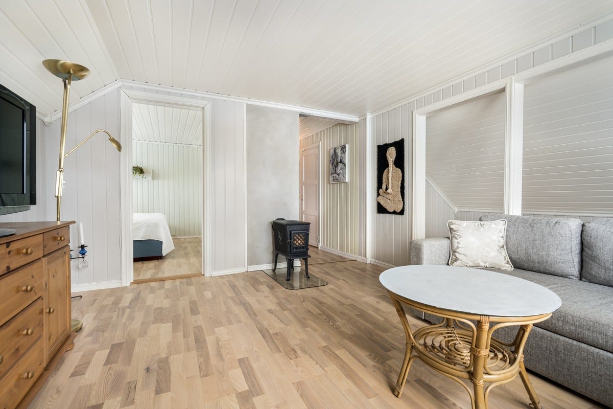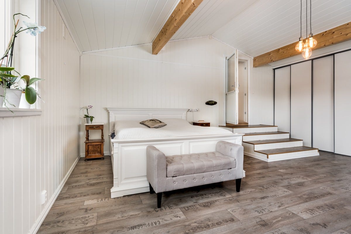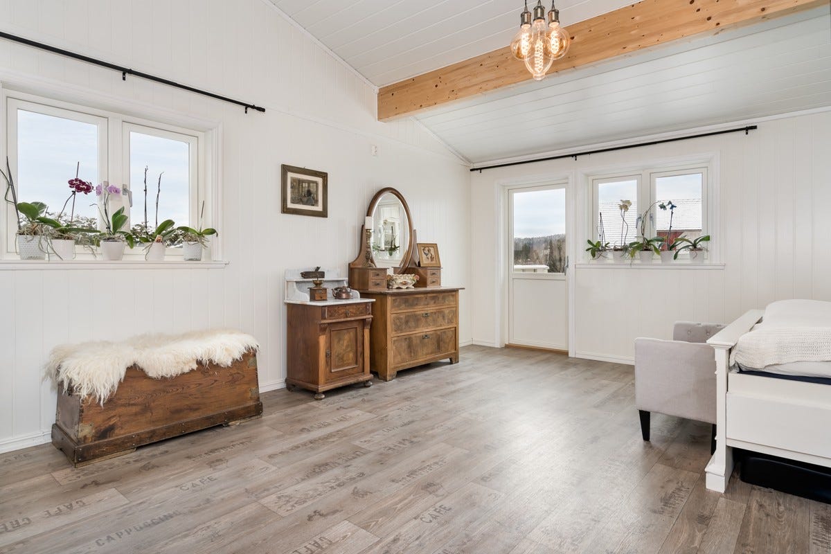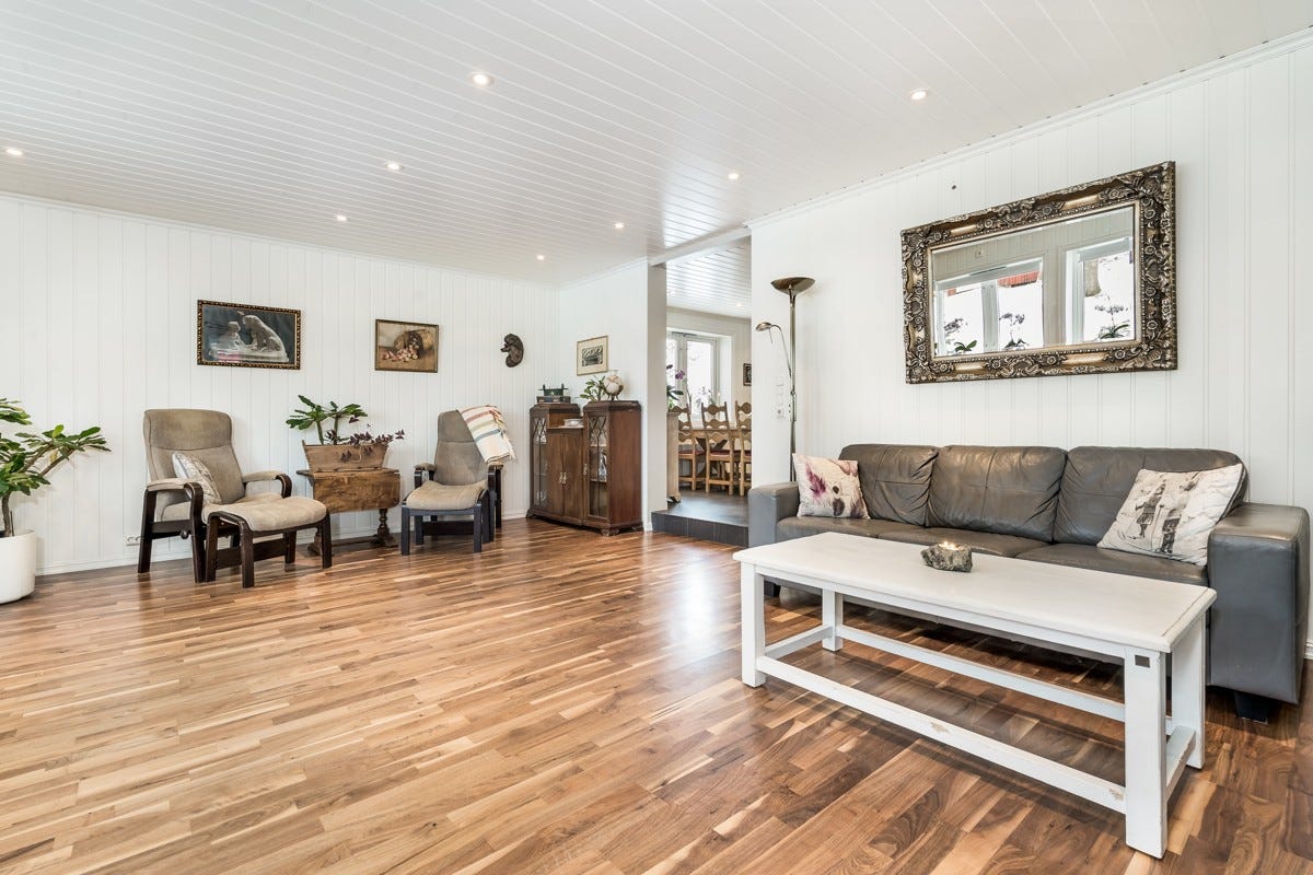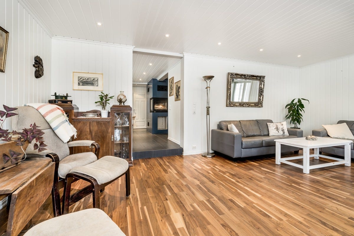 stuen er det parkett. og på nytt oppusset soverom er det vinyl.