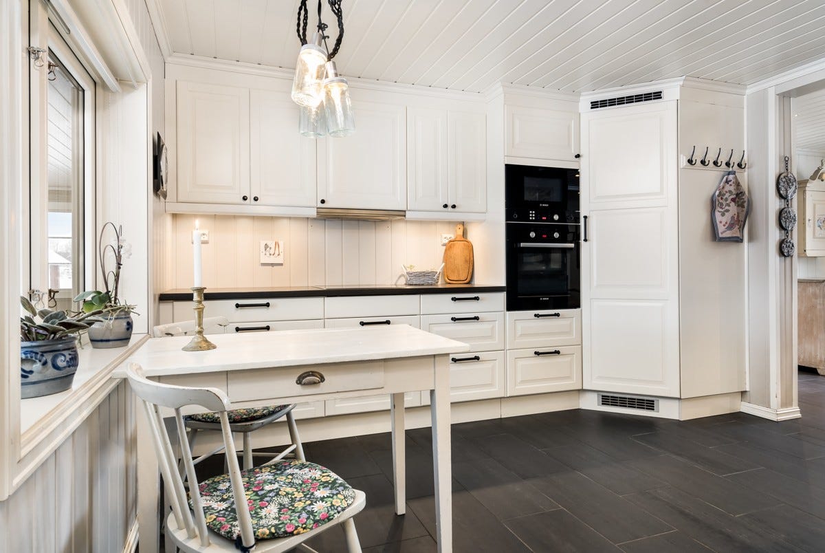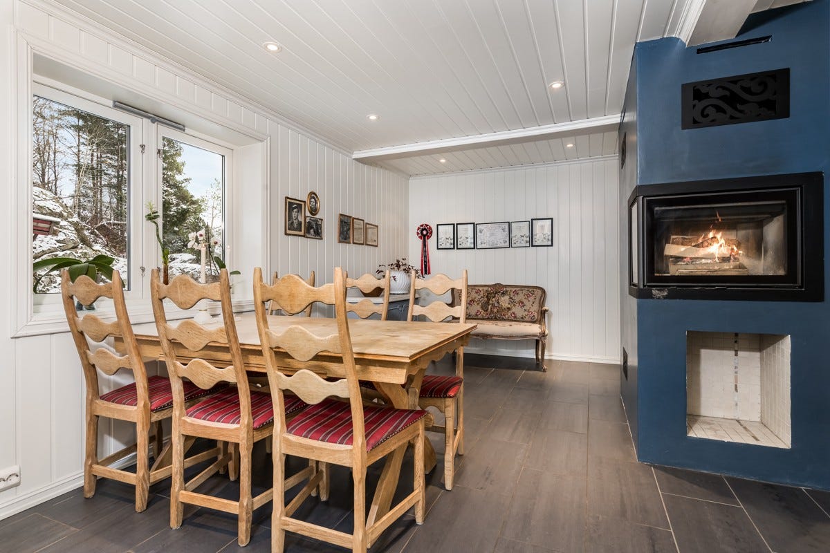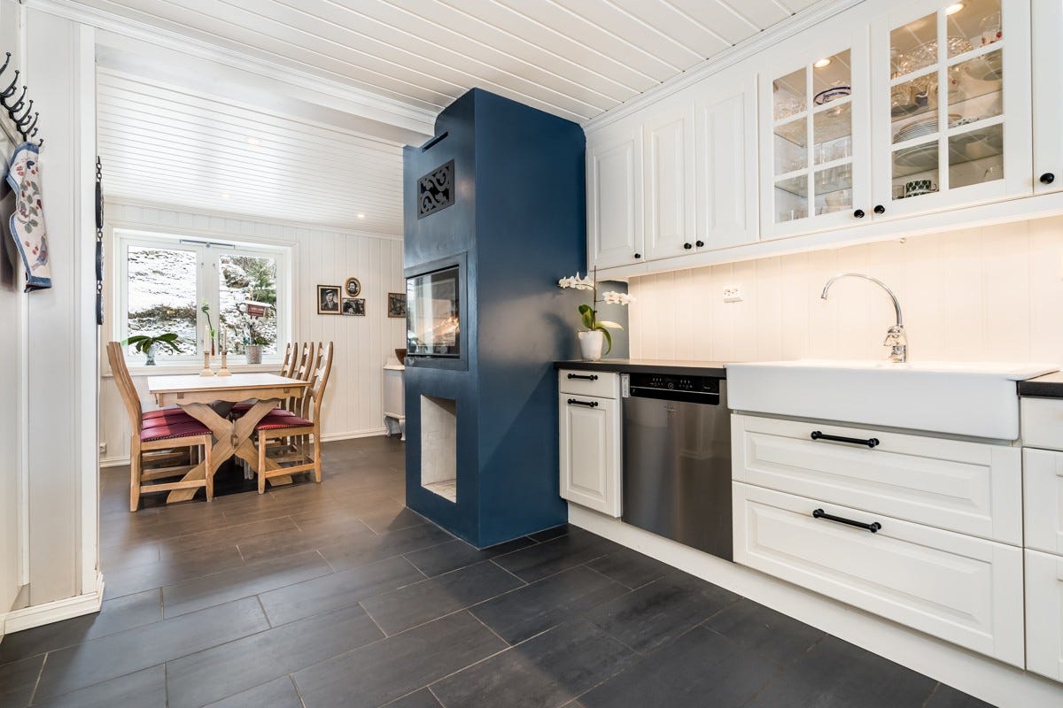 Koselig gårdskjøkken med oppmurt peis mellom kjøkken og spisestue. På kjøkken er det hvitprofilert