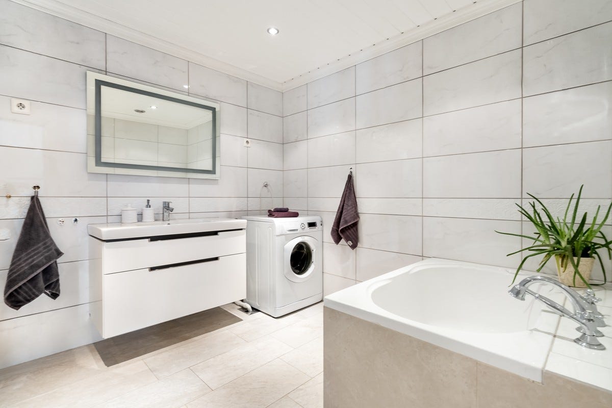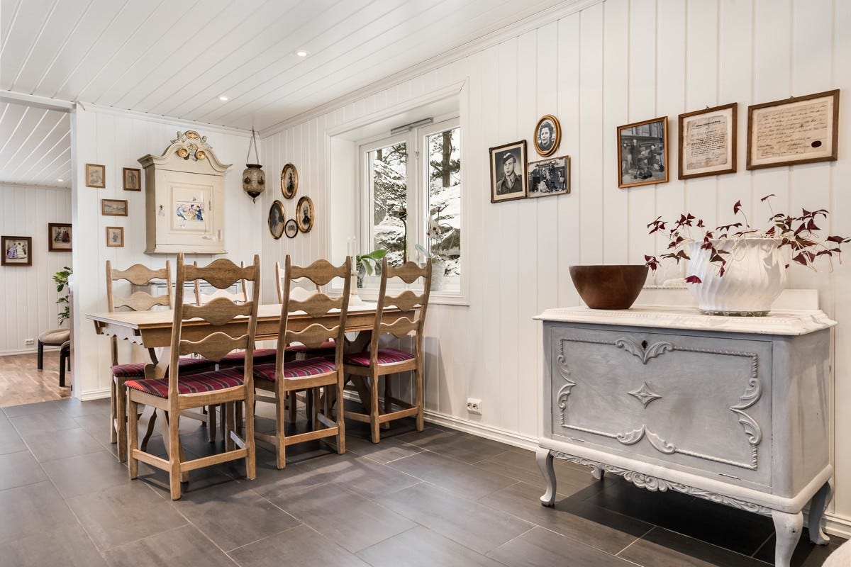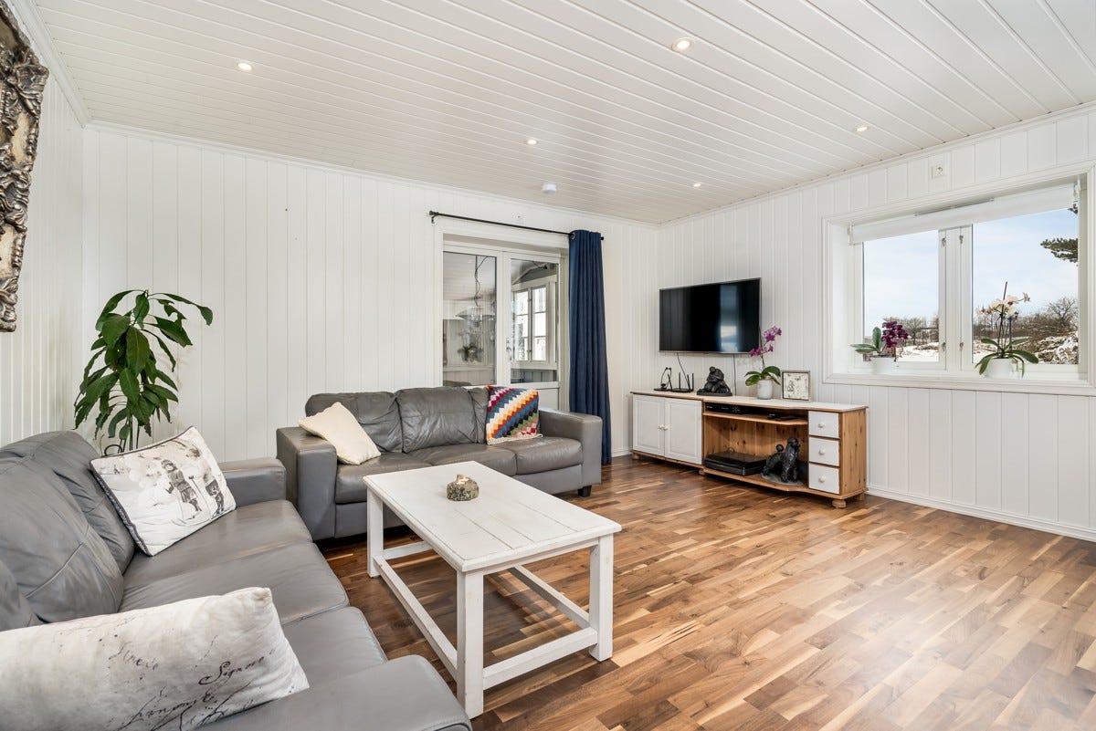 kjølehjørne, oppvaskmaskin, stekeovn og microovn. Avtrekksvifte er ny. Fra kjøkken kommer du til en stor