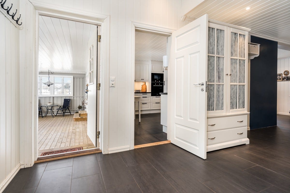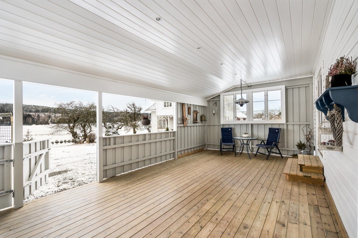 Våningshuset fremstår som solid, lyst og trivelig. Her møtes du av en ny stor overbygd terrasse og delvis