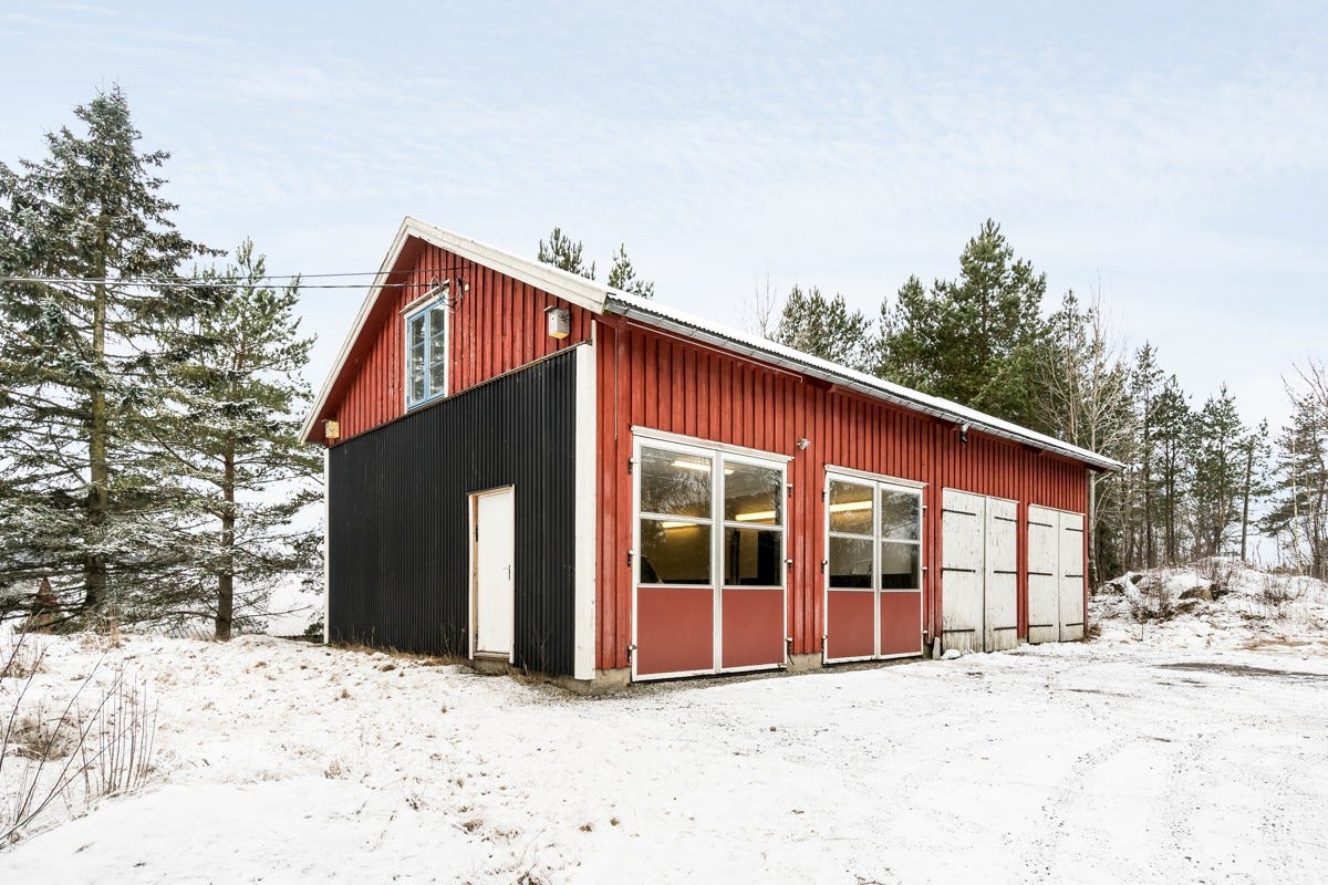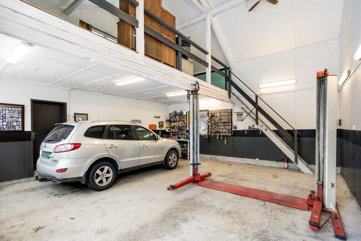 enkel garasje og et kombinert verksted/garasje. Det er store plenarealer med noe fjell opp i dagen rundt