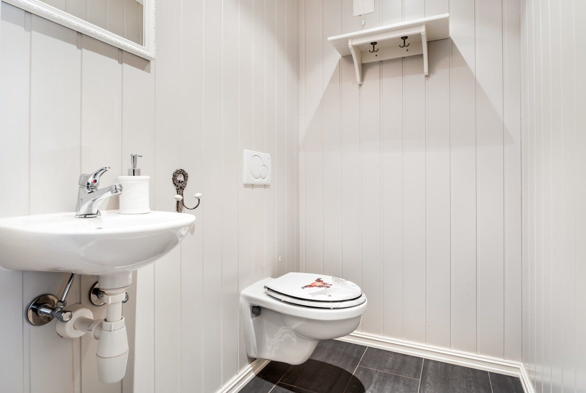 Vegger og tak består i hovedsak av malte panelplater i duse farger (MDF panel vedlikeholdsfri) fliser og
